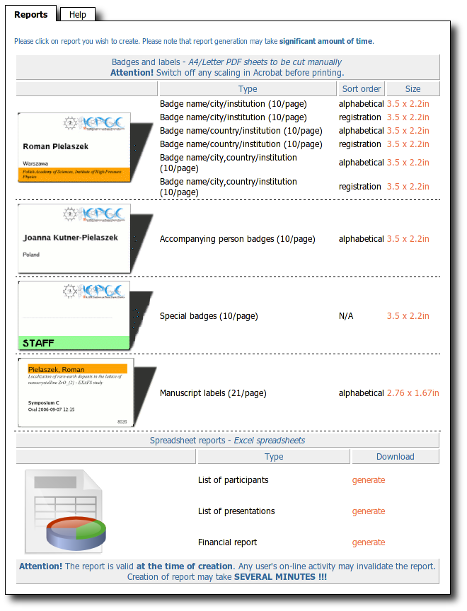 participant badges: PDF files with sheets of labels with
