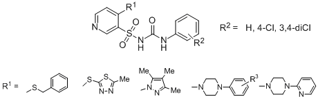 Several compounds were tested in vitro at the National Cancer Institute in Bethesda (USA). This sulfonylureas revealed moderate or reasonable anticancer activity. It could be noticed, that several cancer cell lines exhibit relatively high susceptibility to these sulfonylurea derivatives. Among them, there are cell lines of breast cancer (MDA-MB-468), prostate cancer (PC-3), melanoma (UACC-62 and LOXIMVI) and leukemia (RPMI-8222 and K-562) cell lines. The most active compound N-(4-chlorophenylcarbamoyl)-4-[4-(3,4-dichlorophenyl)piperazin-1-yl]pyridine-3-sulfonamide exhibited significant activity against 7 of human tumor cell lines representing leukemia, colon, melanoma and renal cancer at the low micromolar concentrations, i.e. GI50 ranged from 1.55 to 9.81μM.