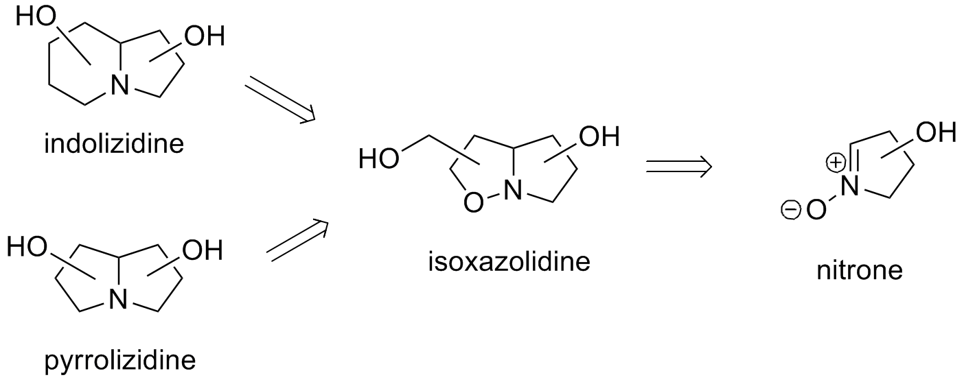 Number natural polyhydroxyleted alkaloids belonging to the pyrrolidine and piperidine classes (iminosugars) and their nitrogen bridgehead bicyclic analogues (pyrrolizidines, indolizidines), as well as a considerable number of non-natural structural analogues, are important glycomimetics [1]. They behave as an enzyme inhibitors, being able to interact with glycosidases and glycosyltransferases – enzymes deputed to the cleavage or formation of glycosidic linkages in the biosynthesis of glycoproteins. Several glycosidase inhibitors have pharmacological relevance, being currently tested or approved in the treatment of diabetes, Gaucher’s disease, osteoarthritis, HIV infection, viral infection, or cancer [1].