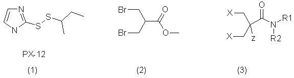 Thioredoxin-1 (Trx-1) is a protein which is over-expressed in many human tumors. The increased level of this protein in cells results in aggressive tumor growth and decreased patient survival. Because of its role in promoting cell survival, proliferation and tumor angiogenesis, Trx-1 is an attractive molecular target. Therefore many studies have been done in order to obtain a selective inhibitor of Trx-1. One of such compounds is 2-[(1-Methylpropyl)dithio]-1H-imidazole (PX-12) (1). It is a small molecule which causes the oxidation of cysteine residues both in thioredoxin reductase (TR) and thioredoxin. But it irreversibly inhibits only Trx-1. [1] The second inhibitor of TR-Trx system is b,b-dibromoisobutyric acid methyl ester(2). [2] Although biological activity of these two compounds is well described in literature, still not much is known about the mechanism of inhibition.