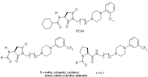 We have previously reported on successful application of combinatorial chemistry techniques for generation of rationally designed libraries of serotonin receptor ligands, namely arylpiperazine derivatives containing N-acylated amino acid fragments [1,2]. It was found, that the kind of substituent at aromatic ring influenced receptor affinity and compounds in vivo 5-HT1A intrinsic activity. Finally, the project allowed selecting a lead compound (PZ 68), pre- and postsynaptic 5-HT1A agonist, which demonstrated distinct anxiolytic-like and antidepressant-like effects in the respective animal models. Taking advantage of the solid-phase chemistry for quick generation of compound libraries, we have designed and synthesized analogs of previously reported long-chain arylpiperazines containing N-acylated amino acid fragments (aspartic acid, proline).