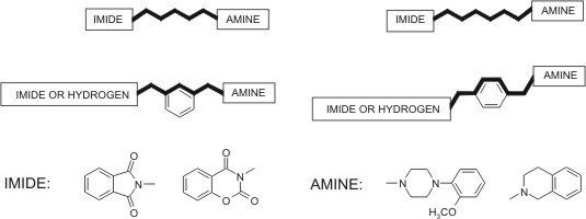 Continuing study of the influence of linker conformation in the structure of long-chain arylpiperazines on the affinity to serotonin 5-HT1A and 5-HT7 receptors [1], new flexible and partly constrained derivatives were synthesized. Well characterized, potent 5-HT1A agents (i.e. NAN-190 and PK 13) were selected as a parent molecules and two series of compounds containing o-metoxyphenylpiperazine or 1,2,3,4-tetrahydroizoquinoline pharmacophores were investigated. Structural modifications involved: elongation of polymethylene chain to five and six carbon atoms and introduction of m-xylene and p-xylene moieties into linker fragment. Results of in vitro binding experiments for 5-HT1A and 5-HT7 receptors are compared to that obtained for previously published analogues with tetrametylene linkers.