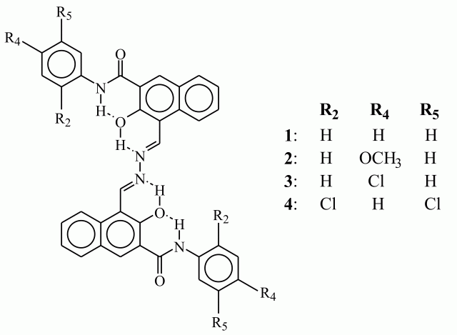Organic pigments generally have a low solubility. Due to this property single crystals of suitable sizes are rarely obtained. Thus many structures of this class of compounds are determined from the powder patterns. The derivatives of Pigment Yellow 101 [1], compounds 1-4, are almost insoluble in most organic solvents even at 200°C. All compounds show fluorescence in the solid state. |