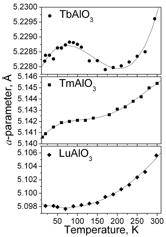 | Perovskite type TbAlO3 and LuAlO3 rare-earth aluminates attract considerable interest as laser media [1,2]. This work is a continuation of our systematic studies on the crystal structure of perovskite type rare-earth aluminates and gallates. Here we report structural investigations on TbAlO3, TmAlO3 and LuAlO3 at low temperatures using high-resolution synchrotron powder diffraction performed at beamline B2 (HASYLAB/DESY). All three compounds possess the GdFeO3 type of structure (space group Pbnm) in the whole temperature range studied (20-300 K) and exhibit quite various thermal behaviours of the lattice parameters. The thermal dependencies of the lattice parameters of LuAlO3 display a rather typical (nonlinear and smooth) increase with temperature, whereas the behaviour of TmAlO3 shows deviations from a “normal” law which are reflected in a “sigmoid” expansion of the lattice along the [100] direction. Unusual trends occur in the thermal behaviour of TbAlO3: at T~60 K all three unique elements of the thermal expansion tensor undergo the zero value which is indicated by the observed extrema on the thermal dependencies of the respective lattice parameters. The thermal expansion coefficient in the [100] direction of the perovskite cell α11 achieves one more negative minimum around 130 K and then increases through the zero value (ca. 200 K). The observed smooth and nonlinear increase of the lattice dimensions in LuAlO3 and the anomalous thermal behaviour occurred in TbAlO3 and TmAlO3 can be associated to interactions between phonons and the electron subsystem of rare-earth ions with open f-shell [3].