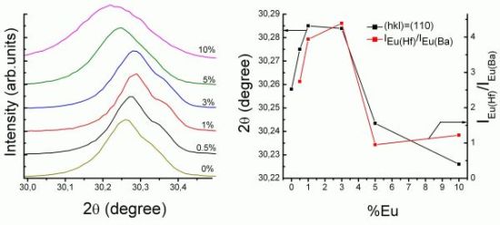 Barium hafnate, BaHfO3 is a valuable host lattice for X-ray phosphors, especially due to its high absorption for ionizing radiation, which results mailny from the presence of two heavy ions, Ba2+ and Hf4+ in the lattice and density reaches 8.5g/cm3. What is also advantageous is that BaHfO3 crystallizes in cubic structure, which allows for transparent ceramics fabrication. These are potentially attractive replacements for monocrystallline materials. Till now research on BaHfO3 was concentrated on Ce-doped powders, because of its fast luminescence decay, so important in dynamic medical techniques. We choose doping with Eu as its red luminescence fits perfectly the region of the highest efficiency of CCDs, which is presently considered a detector of choice for digital planar X-ray imaging. In this technique the relatively slow decay of the Eu3+ luminescence is not an obstacle. BaHfO3:Eu(x%) powders were prepared with ceramic method. The products were examined with XRD technique, SEM, luminescence spectroscopy, synchrotron radiation, radioluminescence. Analysis of the X-ray diffraction patterns of all samples (Fig.1) suggested that the dopant is distributed between both Ba2+ and Hf4+ sites. Yet, for low concentration the fractions of Eu which go the two sites are different than for higher concentration. This conclusion gor support from the results of luminescence, site selective spectroscopy, which allowed us to identify emission lines coming from Eu3+ located in Ba2+ site, as well as occupying the Hf4+ location, and showed that relative intensities of luminescense from the two sites vary strongly mirroring the variation of the diffraction line position (Fig.1). Surprisingly, only the Eu(Hf) ions are active in radioluminescence, while Eu(Ba) are being unable to intercept energy deposited in the host by X-rays.