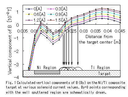 Authors use magnetron sputtering technique for controlling the film composition by modifying the magnetic field with an external solenoid in addition to the magnetic field with a permanent magnet on the back of the composite target[1]. It is necessary to understand the contribution of the solenoid quantitatively for the effective application of this technique. The magnetic field on the target was calculated by the finite element method (FEM), and correspondence with the erosion region was discussed.