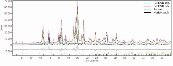 The X-ray powder diffraction has variety applications in the pharmaceutical industry. The most popular is a polymorphs diagnostic of an active substance (API - Active Pharmaceutical Ingredient). If API has more than one crystalline form there is a risk that during following steps like: synthesis, milling, formulation and storage an undesirable form appears. For this reason powder diffraction is a main tool for qualitative and quantitative analysis. The aim of this work was to apply the quantitative Rietveld analysis for an evaluation of API in few commercial drugs. For example, VFEND (Pfizer) tablets contain voriconazole as API. The inactive ingredients include: lactose monohydrate, pregelatinized starch, croscarmellose sodium, povidone, magnesium stearate. Voriconazole1, lactose2 and magnesium stearate are crystalline. The others ingredients are amorphous or semi-crystalline. Qualitative analysis detected only voriconazole and lactose. Relative phase amounts, in weight percent, are following: voriconazole 35.63%, lactose 47.39% and amorphous 16.98% (figure below). The calculated voriconazole content is close to the real quantity which is equal 30%.