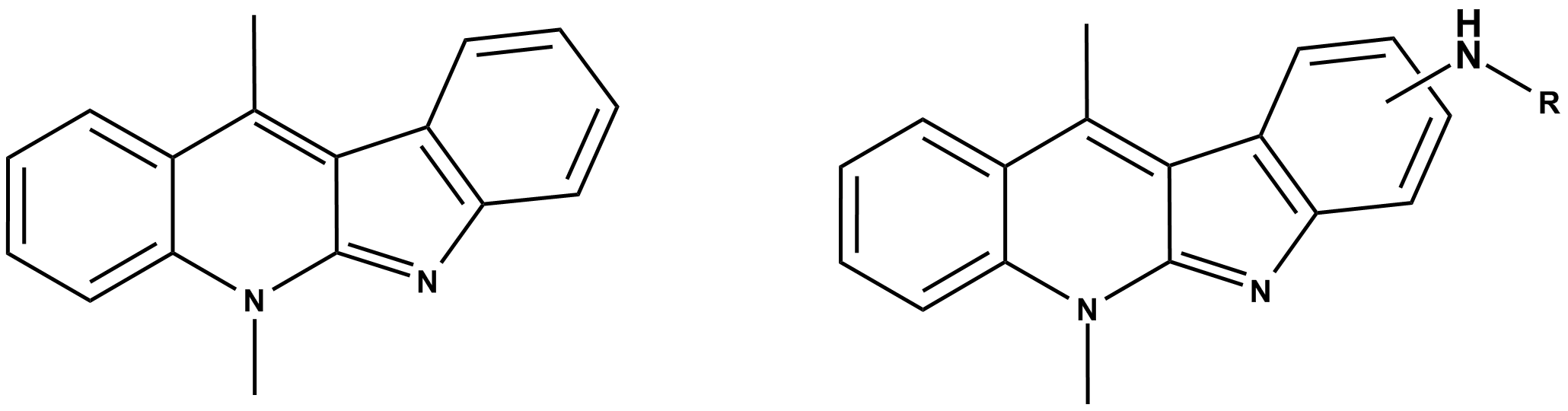 DiMIQ R= Gly-, L-Pro-, D-Pro-,L-His-, D-His-, Gly-L-Pro-, L-Pro-L-Pro-, L-Pro-Gly-, Gly-Gly-, L-His-Gly-. New compounds were evaluated for their cototoxic activity againts KB cell line and antimicrobial activity in vitro, according to a routine procedures. The biological tests showed that all amino acid derivatives of 5,11-dimethyl-5H-indolo[2,3-b]quinoline display significant biological activity. The peptide derivatives of 5,11-dimethyl-5H-indolo[2,3-b]quinoline exhibit similar cytotoxic activity againts KB cells compared to 5,11-dimethyl-5H-indolo[2,3-b]quinoline (DiMIQ). References 1. K.Sidoryk, Ł.Kaczmarek, W.J.Szczepek, J.Wietrzyk, M. Świtalska and W.Peczyńska-Czoch, Polish J. Chem., 82, 2095, 2008. |