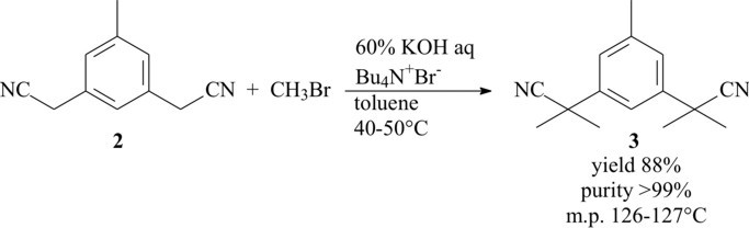 Anastrozole 1 is an anti-tumor drug for the treatment of breast cancer. A key step in synthesis of 1 is exhaustive methylation of 3,5-bis(cyanomethyl)toluene 2, whose elegant synthesis from commercially available 5-methylisophthalic acid was described recently1.