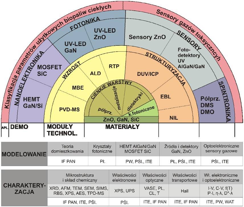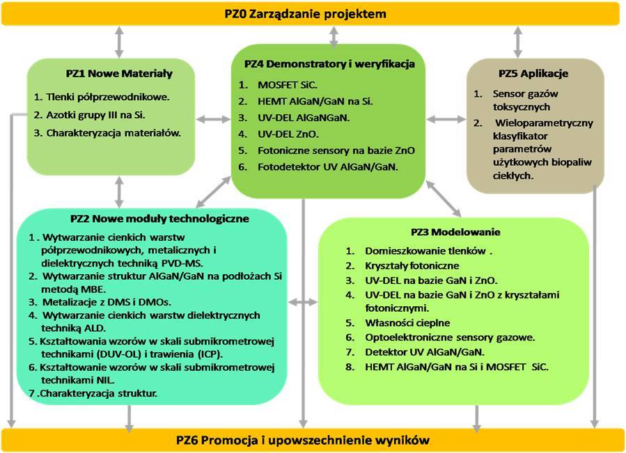 Celem projektu jest opracowanie innowacyjnych rozwiązań technologicznych i konstrukcyjnych, i w oparciu i nie - nowych przyrządów i podzespołów z półprzewodników szerokoprzerwowych ZnO, azotków grupy III i SiC. Prace B+R obejmują następujące główne zadania: (1) domieszkowanie ZnO na typ p i wytwarzanie złącz p-n; (2) wzrost epitaksjalny struktur GaN/AlGaN na podłożach Si; (3) wytwarzanie kryształów fotonicznych z GaN i ZnO; (4) wytwarzanie złącz metal/półprzewodnik o zadanych, specyficznych własnościach elektrycznych i optycznych (kontakty omowe, bariery Schottky'ego, przezroczyste kontakty), odpornych na działania wysokich temperatur; oraz (5) wytwarzanie złącz półprzewodnik/dielektryk o zadanych specyficznych własnościach elektrycznych (dielektryk podbramkowy, pasywacja powierzchni). Innowacyjne technologie i nowe rozwiązania, konstrukcje są opracowywane w połączeniu z modelowaniem i wszechstronną charakteryzacją materiałów i struktur. Procesy technologiczne będą integrowane w moduły technologiczne, a ich efektywność zostanie zweryfikowana w określonych modelowych przyrządach elektronicznych i fotonicznych oraz sensorach. Przyrządami demonstracyjnymi będą: (1) Tranzystory HEMT z AlGaN/GaN na podłożu Si, (2) Tranzystory MESFET i MOSFET z SiC, (3) Diody elektroluminescencyjne 385 nm z ZnO, (4) Diody elektroluminescencyjne UV z AlGaN/GaN z wbudowanym kryształem fotonicznym, oraz (5) Optoelektroniczne sensory gazów na bazie ZnO i GaN. Końcowym wynikiem projektu mają więc być nie tylko modelowe przyrządy półprzewodnikowe, ale również budowa interdyscyplinarnej platformy naukowo-badawczej demonstrującej innowacyjność i konkurencyjność opracowywanych rozwiązań technologicznych, tak w skali czasowej projektu (w postaci demonstratorów projektu) jak też w skali długoczasowej (minimum 5 lat po ukończeniu projektu).