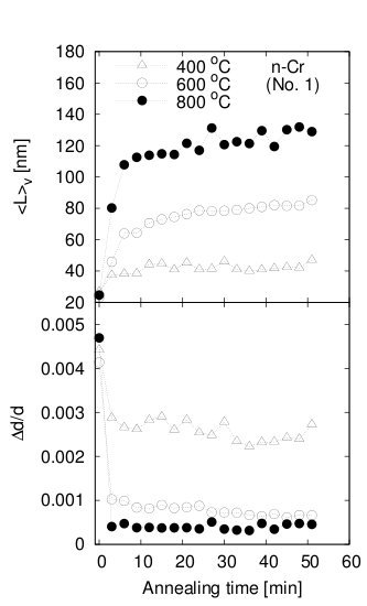 Rysunek 3. Średni rozmiar ziaren n-Cr oraz naprężenia wewnętrzne w funkcji czasu wygrzewania dla trzech temperatur. Wg ref. [2]. Za pomocą analizy Warrena-Averbacha [3] oraz metody „double-Voigt” [4] wyznaczono rozmiar ziaren <L>v oraz naprężenia wewnętrzne Δd/d w zależności od czasu wygrzewania dla temperatur 400°C, 600°C oraz 800°C. Zależność tę przedstawia Rysunek 3. Widać na nim, że największe zmiany zachodzą w ciągu pierwszych 15 min. wygrzewania oraz, że końcowy rozmiar ziaren zależy od temperatury wygrzewania. Dalsze szczegóły tych badań są opisane w pracy [2]. Bibligrafia [1] E. Fawcett, Rev. Mod. Phys. 60 (1988) 209. [2] D. Wardecki, R. Przeniosło, A. Fitch, M. Bukowski, R. Hempelmann, J. Nanopart. Res. 13 (2011) 1151. [3] B. Warren, B. Averbach, J. Appl. Phys. 21 (1950) 595. [4] D. Balzar, Defect and Microstructure Analysis from Diffraction, (Oxford Uuniversity Press, New York, 1999). |