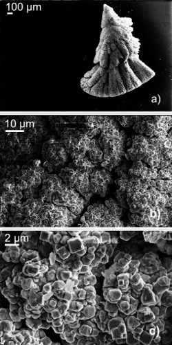 Rysunek 1. Fotografie SEM wykonane dla próbki n-Cr z następującymi powiększeniami: 60X (a), 2120X (b) oraz 8010X (c). Wg ref. [2].