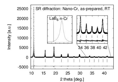 Chrom posiada interesującą strukturę magnetyczną, która wielokrotnie była badana i opisana w literaturze [1]. W monokryształach chromu (a także w próbkach polikrystalicznych), poniżej temperatury Neel'a TN= 310 K, występuje tzw. fala gęstości spinowej z długością modulacji ok. 6.5 nm. Interesującym wydaje się poznanie wpływu rozmiaru małych ziaren chromu (rzędu 25 nm) w tzw. nanokryształach (n-Cr) na wyżej wymienione uporządkowanie magnetyczne. Niniejsza praca skupia się na analizie mikrostruktury tj. rozmiaru ziaren oraz mikronaprężeń wewnętrzych podczas wygrzewania. Dane uzyskano za pomocą dyfrakcji promieniowania synchrotronowego w n-Cr otrzymanym metodą elektrodepozycji. W wyniku procesu elektrodepozycji, przy różnych proporcjach substratów CrO3 oraz H2SO4, wyprodukowano cztery próbki nanokrystalicznego chromu (n-Cr) [2]. Następnie próbki te scharakteryzowano za pomocą pomiarów TEM, SEM oraz EDX. Rysunek 1 przedstawia fotografie próbki n-Cr ze skaningowej mikroskopii elektronowej. Dla różnych powiększeń tej samej próbki widać skupiska krystalitów, które przejawiają cechy samopodobieństwa. Próbki n-Cr przebadane zostały za pomocą dyfrakcji promieniowania synchrotronowego (SR) w European Synchrotron Radiation Facility w Grenoble (linia ID-31). Rysunek 2 przedstawia wynik pomiarów dyfrakcyjnych (długość fali λ=0.4 Å) dla n-Cr w temperaturze pokojowej (punkty) oraz obliczony dyfraktogram (linia ciągła) w oparciu o model struktury chromu bcc [1]. Na powiększeniu po prawej przedstawiony został zakres dużych kątów 2Θ, po lewej natomiast maksimum dyfrakcyjne (110) od n-Cr w zestawieniu z maksimum zmierzonym na tym samym dyfraktometrze dla próbki odniesienia LaB6. Widać, że maksimum Braggowskie od LaB6 jest ok. 25 razy węższe od maksimum pochodzącego od n-Cr.