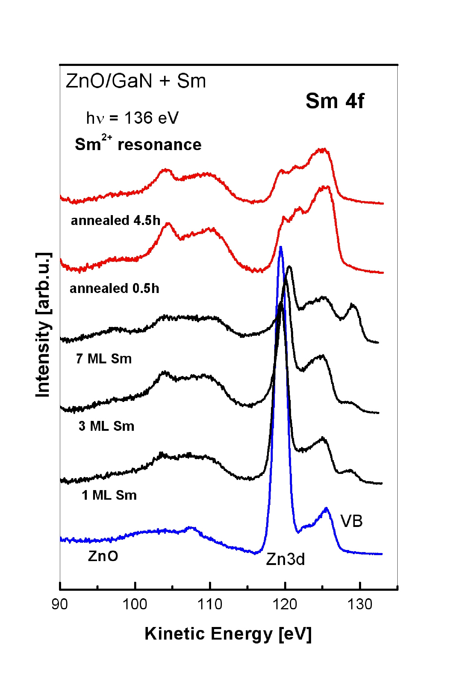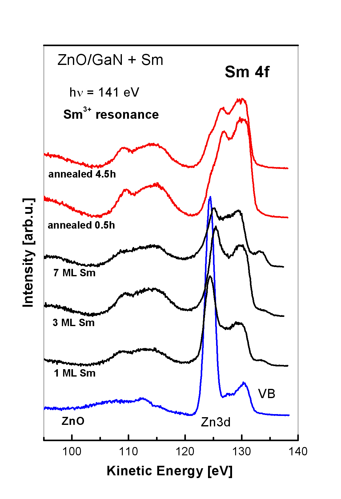 The ZnO samples were grown by atomic layer deposition (ALD) in the Institute of Physics Polish Academy of Sciences in Warsaw. The main advantage of this method is a self limitation and sequential growth process, which enables using very reactive precursors and reducing growth temperature, while keeping good crystallographic and optical parameters. The polycrystalline and epitaxial ZnO films were deposited at 300ºC on a Si and a GaN/Al2O3 template, respectively. Deposition of Sm atoms onto the ZnO surface and photoemission measurements were performed at the FLIPPER II beamline in HASYLAB synchrotron radiation laboratory (Hamburg, Germany). Samarium was deposited from a Knudsen cell under ultra-high vacuum conditions at room temperature. Sm atoms were evaporated sequentially to obtain capping layers with the thickness of 1 ML, 3 ML and 7 ML. After the last deposition the samples were annealed for 0.5 and 4 hours at 300ºC. The set of energy distribution curves (EDC) was acquired after each step of the deposition and annealing processes. The investigations of Sm/ZnO system by resonant photoemission spectroscopy were carried out for the photon energy range of 130-160 eV that corresponds to the Sm4d→Sm4f Fano resonance region [4]. For the 4f6 (Sm2+) and the 4f5 (Sm3+) configurations, two resonant photoemission processes occur: