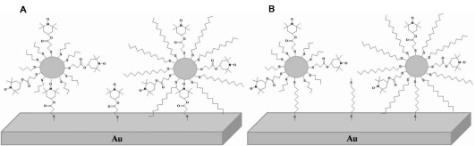 Stable free radicals TEMPO (2,2,6,6-tetramethyl-1-piperidine-1-oxyl) and its derivatives have been widely employed as spin labels [1], spin traps [2] and antioxidants [3] in the biomedical field, as mediator in „living” free radical polymerization [4], and as catalysts in aerobic oxidation processes [5]. The TEMPO radicals can also interact with gold electrode surface or gold nanoparticles and create the Au-NO bonding[6, 7]. Nanoparticles modified with single–component TEMPO-Thiol monolayer and mixed monolayers composed of bis[2-(4-oxy-2,2,6,6-tetramethylpiperidine-1-oxyl)ethyl] disulfide (TEMPO-DiSS) and alkanethiols (with four or twelve methylene groups) were synthesized[8]. Electrochemical behavior of the three types of NPs was studied, and their diffusion coefficients in solution and surfaces coverages were determined. We found that the interaction between gold and TEMPO nitroxyl radicals may be useful as a method of binding gold nanoparticles to gold electrode surfaces.The nanoparticles were adsorbed on bare gold electrodes, and on the TEMPO-Thiol (Rys. A), or 1,9-nonanedithiol (Fig. B) modified gold electrode. Using cyclic voltammetry (CV), scanning tunneling microscopy (STM) and infrared spectroscopy (IR), we could compare the properties of the gold nitroxyl radical interaction with the well known gold- sulfur bonding.