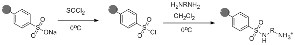 Emperor 2000® carbon nanoparticles are a form of carbon black with surface sodium sulfonate groups. This negative surface coverage is initially converted to positive amine functionality with reaction with a diamine. [1] The aminated carbon nanoparticles can then be subjected to further synthetic reactions.
