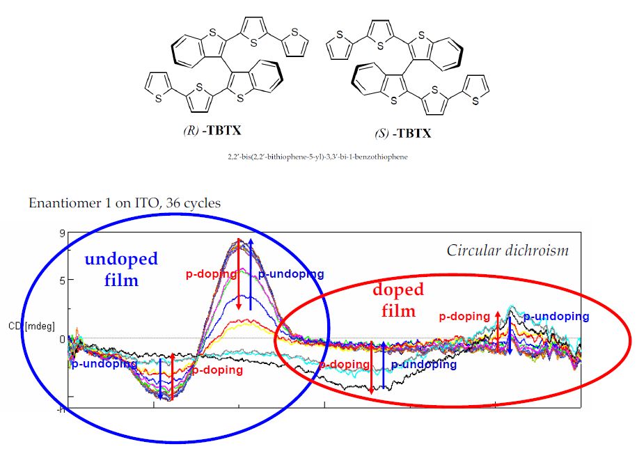 The availability of materials able to couple electroactivity and enantiorecognition capability is an ambitious objective of the current chemical research, aiming to both electrically triggered enantioselective electron transfers and electrically monitored enantioselective recognitions. Ideal candidates are organic conducting polymers, several of which have been functionalized with chiral pendants; this "localized" approach, however, appears to lead to poor chirality manifestations. We present inherently chiral conducting films prepared by electropolymerization of monomers like the TBTX molecule in the figure, where chirality is owed to a tailored torsion internally produced along the whole conjugated backbone, and not to the presence of stereocentres external to the conjugated chain. Both enantiomer films have been characterized together with the racemate one by CV, EIS, and circular dichroism with in-situ electrochemistry. Positive charge injection, reducing the torsion angle to achieve better π system conjugation, results in a fully reversible "breathing" process of the 3D chiral conducting network upon potential cycling. Enantiorecognition capability tests on chiral probe molecules are in progress. |
