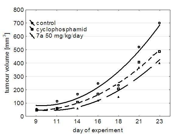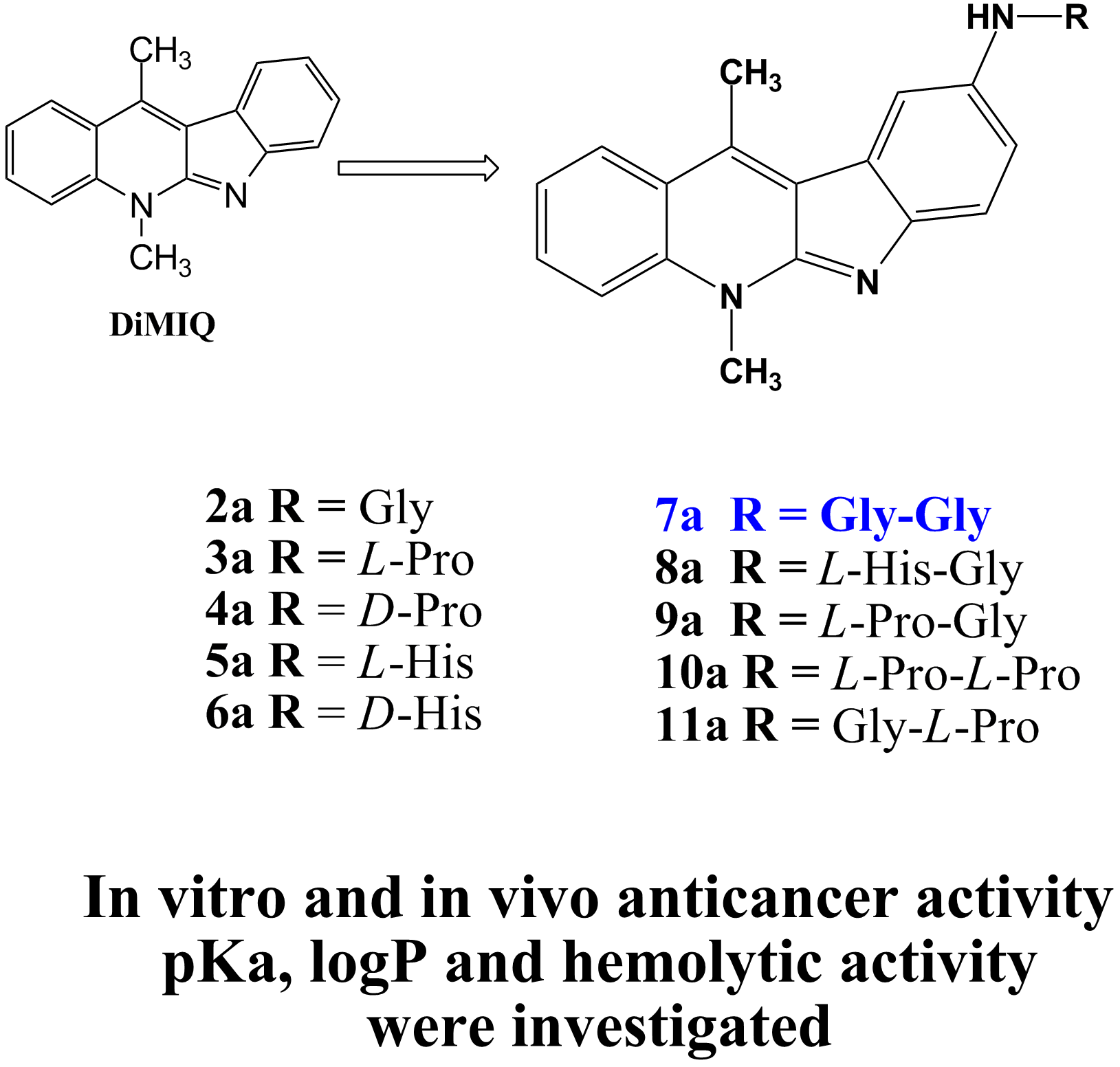 The syntheses of neocryptolepine derivatives containing an amino acid or a dipeptide at the C-9 position, their evaluation for antitumor activity in vitro and in vivo were reported. To establish the influence of the amino acid or the peptide on the physicochemical properties of 5H-indolo[2,3-b]quinoline (DiMIQ), lipophilic and hemolytic properties were investigated. Most of the compounds displayed a high anticancer activity in vitro, and strongly inhibited growth of tumor in mice compared to cyclophosphamide. The attachment of the hydrophilic amino acid or peptide to the hydrophobic DiMIQ increased its hydrophilic properties, and decreased its hemotylic activity. The glycylglycine conjugate (7a) was the most promising derivative. It strongly inhibited the growth of the tumor in mice (at dose 50mg/kg/day it inhibited the tumor growth by 46-63% on days 11th-16th, and by 29-43% on day 18th-23th), and significantly decreased hemolytic activity and lowered the in vivo toxicity compared to DiMIQ.