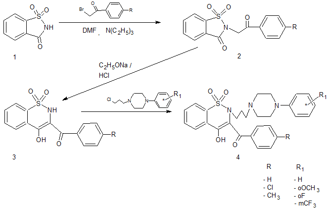 We are searching for new anti-inflammatory agents devoid of the limitations and side effects of the classical non steroidal anti-inflammatory drugs. Oxicams, like piroxicam, meloxicam or tenoxicam, represent a newer chemical category of the enolic acids, used in the treatment of chronic rheumatic diseases. In previous communications we reported the synthesis and anti-inflammatory evaluation of their pyridine-analogues. Some of them exhibited, depending on the substituents in position 2 and 3 pyridothiazines ring, anti-inflammatory, analgesic, antitumor and antioxidant action [1-5]. The pronounced biological action of the pyridothiazines stimulated us to continue our search and prepare their analogues, modified at the pyridine ring, in order to evaluate the influence of this structural change on biological activity. A series of new 4-hydroxy-3-(4-substituted-benzoil)-2-[3-(4-(R1-substituted-phenyl)-1-piperazinyl)propyl]-2H-benzo-1,2-thiazine 1,1-dioxides was synthesized starting from commercially available saccharine. Saccharine 1 was reacted with 4'-substituted-2-bromoacetophenone in N,N-dimethylformamide (DMF) to provide the N-alkylated product 2. Compound 2 on refluxing in sodium–ethanol resulted in ring expansion and formed cyclic sulfonamide 3. It was further alkylated with 4-(R1-substituted-phenyl)-1-(3-chloropropyl)piperazine resulting in the corresponding coupled product 4. The structure of the final products 4 was confirmed by elemental analysis and spectral analytical methods (IR, H1NMR). The newly obtained compounds were qualified for pharmacological tests in Jagiellonian University Medical College, Kraków, Poland. References: 1. Toa Eiyo Kagaku Kogyo, pat. Jap., 8436685 (1984); C.A. 101, 7177a 2. Saito K., Okutani K.: Yakugaku Zasshi, 106 (1986) 1008; C.A. 107, 77727c 3. Zawisza T., Malinka W.: Farmaco 41 (1986) 892 4. Malinka W., Kaczmarz M., Filipek B., Sapa J., Głód B.: Farmaco 57 (2002) 737 5. Malinka W., Kaczmarz M., Redzicka A.: Acta Pol. Pharm. Drug Res. 61 (2004) 100 |
