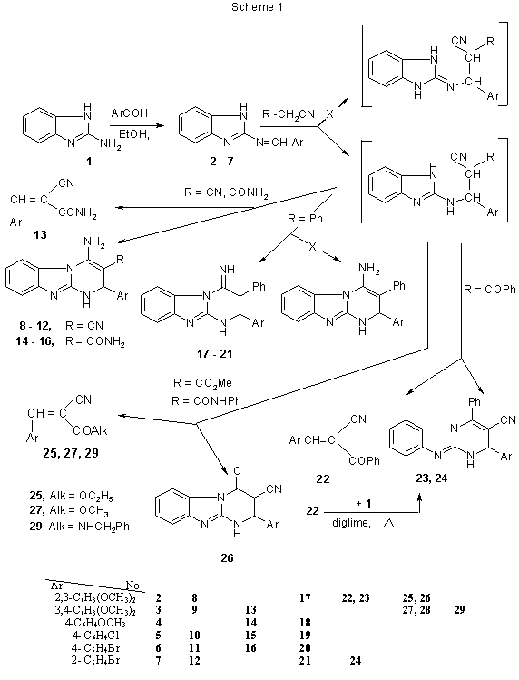 Schiff bases 2-7 obtained from 2-aminobenzimidazole (1) with 2,3-dimethoxy-, 3,4-dimethoxy-, 4-methoxy-, 4-chloro-, 4-bromo- and 2-bromobenzaldehyde. A series of pyrimido[1,2-a]- benzimidazole and α-cyanocinnamic derivatives have been synthezied in the reactions of Schiff bases 2-7 with selected nitriles α-containing active methylene group: malononitrile 8-12, cyanoacetamide 13-16, benzoylacetonitrile 17-21, benzylonitrile 22-24, cyanoaceticmethyl ester 25-28 and cyanoacetic benzylamide 29 (Scheme 1). The structure 8-29 were confirmed by the results of elemental analysis and their IR, 1H-, 13C-NMR and MS spectra.