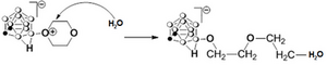 Boron-containing compounds are actually widely used as insecticides, bactericides, reducing reagents (organic chemistry), catalysts, materials for the production of some types of ceramics, the liquid crystal components, temperature-resistant polymers and many others. As potential drugs, they were met with great interest in cancer therapy using technique called “Boron Neutron Capture Therapy” (BNCT). The idea of this therapy is based on the fact that we target molecules containing boron isotope 10B into the tumor cells or in their direct surrounding. Tumor tissue is subjected to irradiation in a stream of slow neutrons. Boron atoms are able to capture neutron and as a result, they disintegrate with emittion of alpha particles. Nowadays, scientists test a big variety of boron carriers including: amino acids, sugars, lipids, porphyrins, DNA-oligonucleotides and their components-nucleosides. Carboranes are boron cage systems in which one or more carbon atoms are bound as an integral part of electron-delocalized borane framework. They are characterized by high boron content, remarkable thermal and chemical stability, spherical geometry and high hydrophobicity. Hydrophobicity is the main reason why particularly important are reactions of boron clusters with macromolecules in aqueous or aqueous-organic solutions. Techniques of mass spectrometry (ESI-MS/MS) are not common for analysis of compounds containing boron. This is due to the generation of complex spectra related to the natural content of boron isotopes 10B and 11B. However, these techniques have the high possibilities of throughput for sample analysis. Analyzed compounds were carborane and carborane metal complexes adducts of dioxane that were generated in order to react with biomolecules. We proved that in an aqueous-organic solution undergo structural modifications in the structure of the dioxane ring of cluster boron adduct. Mechanism of structure modification was determined as binding of the water molecule that is shown below: