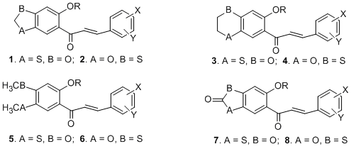 Chalcones are widely explored as potential lead compounds for new drugs, including antitumor medicaments [1-10]. In vitro cytotoxicity of most of chalcone derivatives is in 1 – 50 micromolar range. Now we found that chalcones bearing a fused oxathiole ring (1 or 2) display cytotoxic activity even in a nanomolar range, e.g. for compound AMG-304 (5, R = CH3, X = 4-OCH3, Y = 3-OH), IC50 = 10 nM (A549) and 5 nM (HeLa). Change of the ring size from five to a six membered one (3, 4) does not influence much the activity, while opening of the heterocyclic ring (5, 6) or its substitution in the position 2 with oxygen (7, 8) diminish the activity (Figure 1). Figure 1.