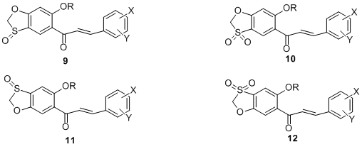 Oxidation of isomer 1 to sulfoxide (9) or sulfone (10) result in decrease in cytotoxicity, while analogous oxidation of isomer 2 lead to derivatives 11 and 12 with increased cytotoxic activity (Figure 2). Figure 2.