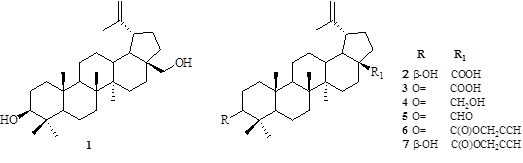 | Betulin [lup-20(29)-ene-3β,28-diol, C30H50O2] (1), also known as betulinic alcohol, is a pentacycylic triterpene of the lupane type which was one of the first natural products indentified and isolated from plants as a pure chemical substance in 1788 by Lowitz [1]. The high content of betulin (up to 30%) in white birch bark and the ease of its isolation in almost any amount, make it important starting material for synthesis of new compounds.