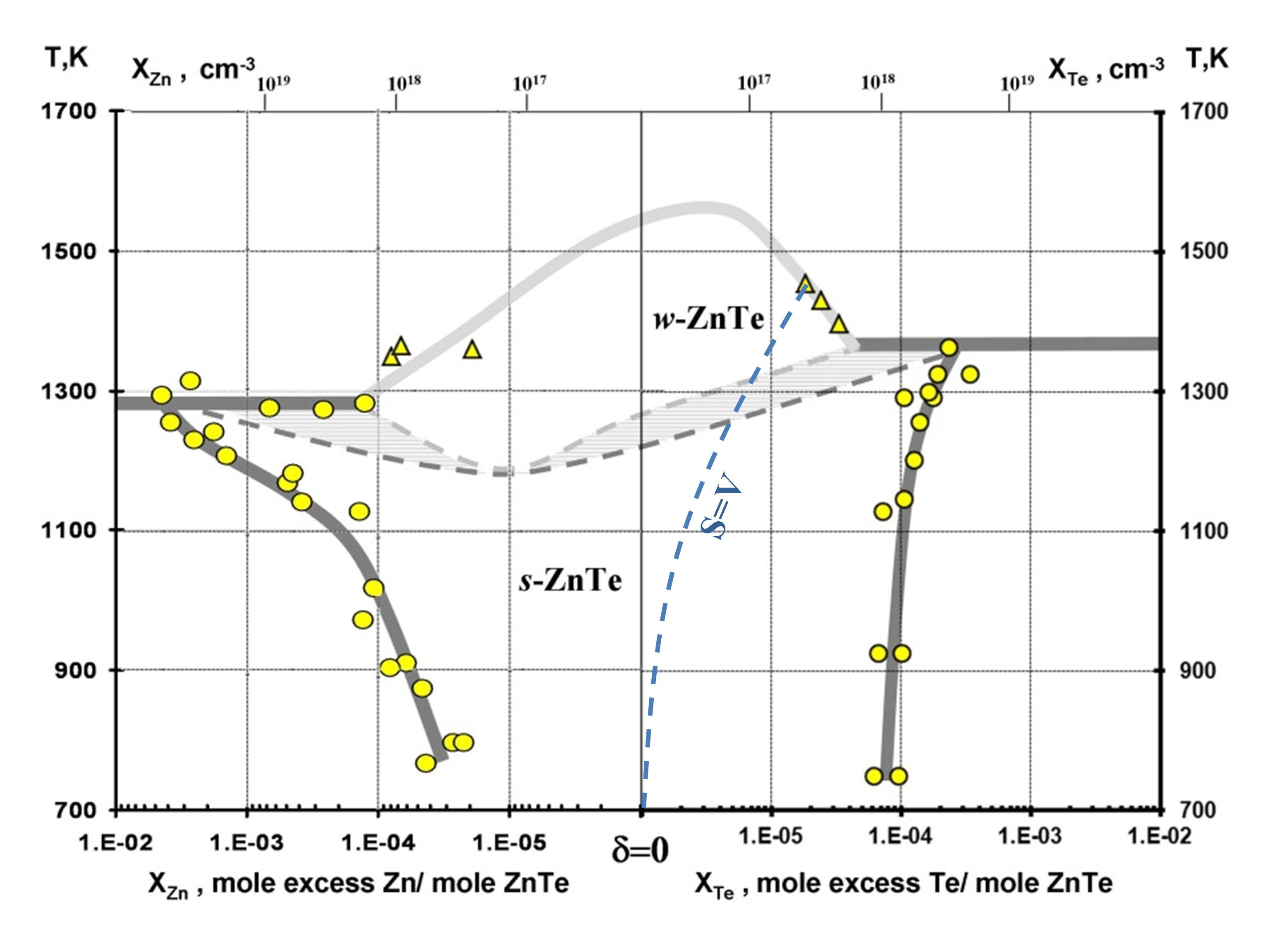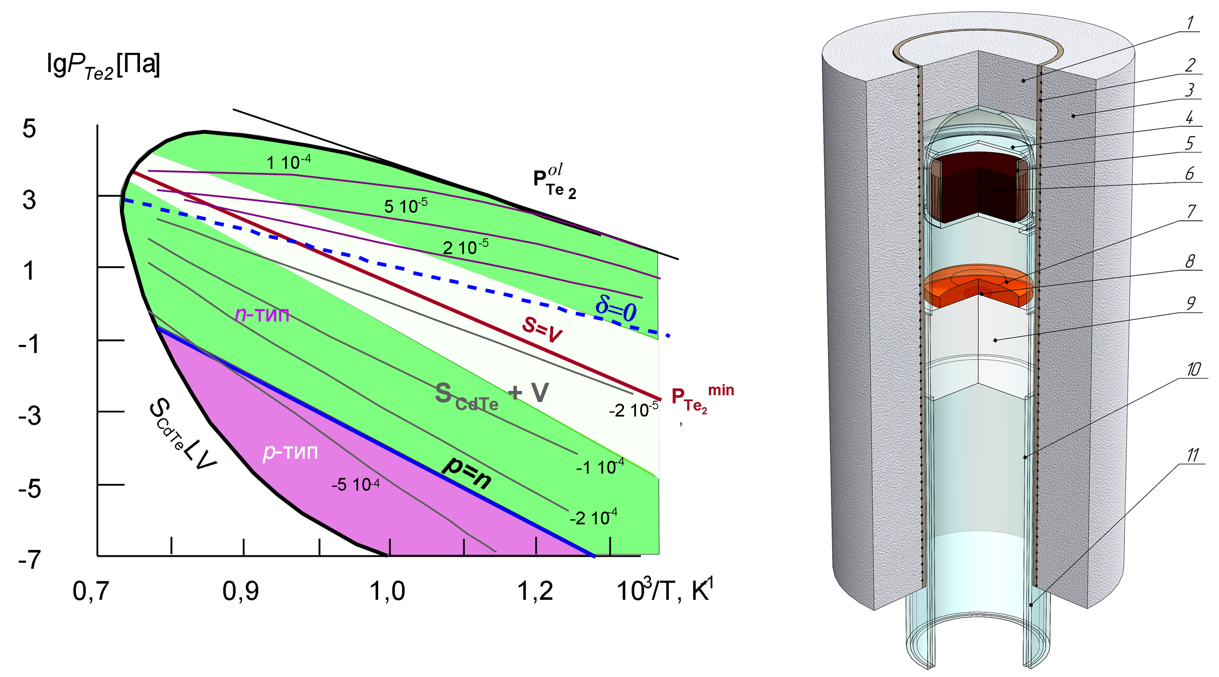 Fig.1. The scheme of CdTe and ZnTe vapor crystal growth by Markov-Davydov technique. Setup scheme (right) 1- thermo insulating cover, 2- ceramic tube, 3- thermoinsulation, 4- quartz glass reactor, 5- polycrystalline ingot, 6- quartz glass crucible, 7- growing crystal, 8- seed, 9- sapphire piedestal, 10- quartz glass tube, 11- plung for vacuume system connection. PTe2-T projection of Cd-Te (left). Figures on isoconcentration lines shows the excess Te ("-" Cd) concentration at bivariant Ss-CdTeV equilibrium. The white area covers the range of stable single crystal growth conditions. The study of ZnTe and CdTe homogeneity ranges by direct physico-chemical method [2] in the temperature range 750-1365 K added by XRD analysis let us proposed the scheme of 3C-2H polymorphous transition in ZnTe and CdTe compounds. We proposed that polymorphous transition is followed by peritectic reactions at both Te-riched and Zn(Cd)-riched sides (Fig.2,3). Fig.2. Homogenity region of ZnTe with the proposed scheme of 3C-2H polymorphous transformation For the first time it was demonstrated that homogeneity region of undoped ZnTe included stiochiometric composition. Analysis of luminescent and electrical properties of the as-growm and heat treated at different partial pressures single crystals was conducted.