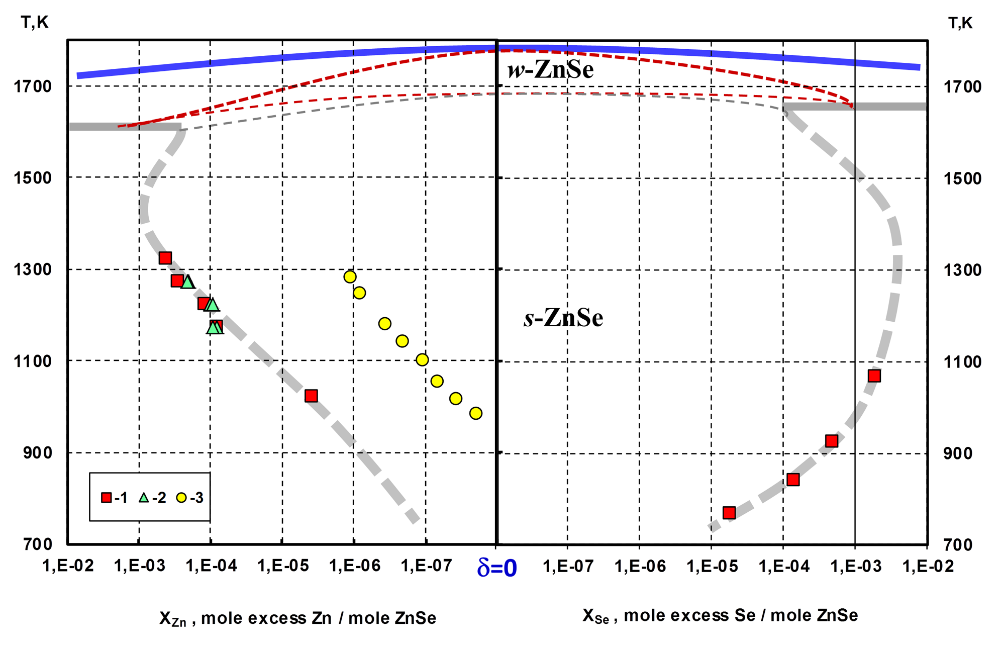 ZnSe single crystals are of great interest as perspective materials for X-ray detectors and VIS-IR transparent windows for lasers. But till now there is no sufficient data on ZnSe homogeneity region, especially with the emphasis on wurtzite - sphalerite (3C-2H) polymorphous transformation close to the melting point. The proposed scheme of this transformation was performed in [1] based on DTA experiments. In the present research we studied ZnSe homogeneity region by direct physical-chemical method [2] in the temperature range 765-1320 K (Fig.1). It was found out that homogeneity region of undoped ZnSe included stoichiometric composition and retrograde behavior of solidus lines both from Zn- and Se-rich sides was observed. Comparison of Zn nonstoichiometry with the of ionized defect concentrations at Ss-ZnSe-L(Zn) equilibrium let us say that at the above conditions the dominant point defects are electrically neutral. ![]() Fig.1. Homogeneity region of ZnSe with the proposed scheme of 3C-2H polymorphous transformation [1]: 1, 2- our data, 3 – calculated from free carrier concentrations [3]. In the research we studied the crystal properties produced by vapor and melt growth techniques. The vapor growth was conducted by Markov-Davydov method [4]. The crystals did not touch in contact with growth reactor walls and was grown on a sapphire substrate. As-grown crystals were 100 mm diameter and 20-25 mm height. Other crystals were grown from the melt by directional solidification under high (100 atm) static pressure. The melt growth was conducted from graphite and glass carbon crucibles. As a source materials we used CVD-ZnSe [5] and muli-resublimation process (4 steps) in dynamic vacuum. Due to ICP-MS analysis melt grown crystals in carbon glass crucible and vapor grown crystals were as pure as source materials. In case of a graphite crucible we observed a decrease of crystals purity. Nonstoichiometry of all materials was examined. For the crystals the correlations between growth conditions, nonstoichiometry, luminescent properties (Fig.2) were found out.