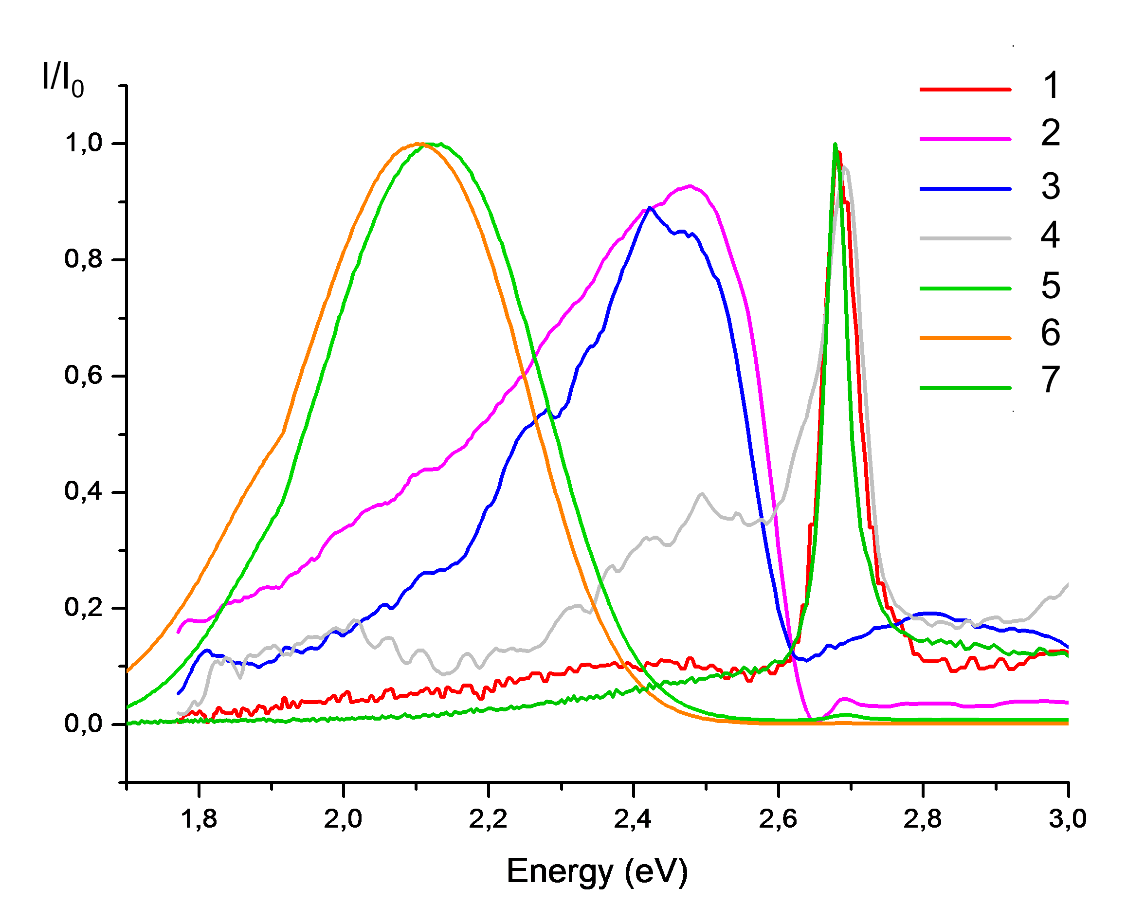 Fig.2. PL spectra of ZnSe preparations at 300 K ( λext=370 nm): 1-resublimated polycrystal, 2- CVD-ZnSe N1 after synthesis, 3- CVD-ZnSe N2 after synthesis, 4- CVD-ZnSe N2 (after extraction of an excess component), 5-melt grown crystals at high pressure in graphite crucible, 6- melt grown crystals at high pressure in glass-carbon crucible, 7- vapor grown crystal. In case of vapor grown crystal (7) and resublimated ZnSe polycrystal we observed exciton peak 2.68 eV with FWHM 0.04 eV and 0.06 eV, correspondingly. Melt grown crystals demonstrated 2.10 eV (6) and 2.13 eV (5) luminescence with FWHM 0.35 eV, which could be attributed with Se nonstoichiometric defects in ZnSe crystals. Synthesized CVD-ZnSe preparations were characterized by complex spectra but the main peaks were 2.48 eV (3 ) and 2.69 eV (2). According to nonstoichiometry determination these peaks were attributed with excess Zn in CVD-ZnSe preparations. The research was supported by Ministry of Education and Science of Russia by grant N 16.513.11.3144 1. Okada H., Kawanaka T. J. Cryst. Growth. 165 (1996) 31-36. |