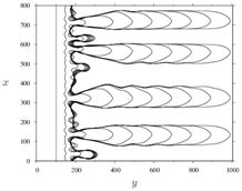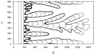 Fig.1: Time evolution of an irregular step pattern(upper) and a periodic comb-like pattern(lower). [1] H. Hibino, H. Kageshima and M. Uwaha: Surf. Sci., 602 (2008) 2421. [2] S. Kondo, M. Sato, M. Uwaha and H. Hibino: Phys. Rev. B 84, 045420 (2011). |