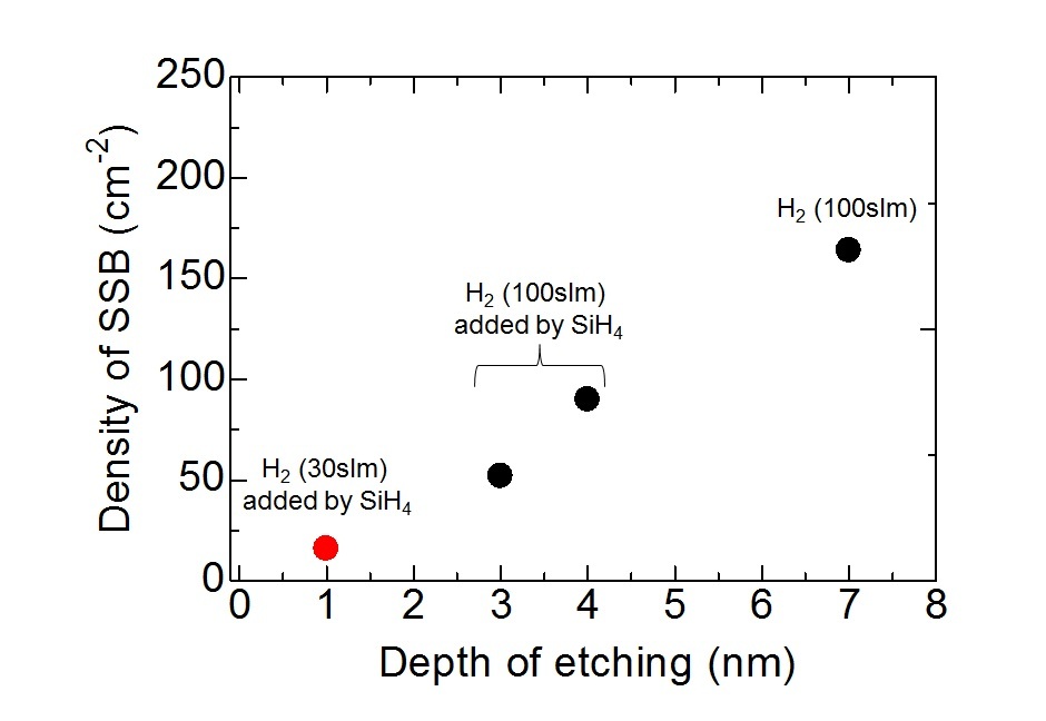 SiC homoepitaxial layers grown on substrates with vicinal off-angle (epi-layers with vicinal off-angle) are effective for suppressing anisotropy of SiC trench devices. Step bunching, however, is easily generated on the substrates with vicinal off-angle during increase in temperature at H2 atmosphere prior to the growth of the epi-layers. It is indispensable to suppress the generation of step bunching during increase in temperature in order to improve the surface morphology of the epi-layers with vicinal off-angle. It is thought that the etching reactions between the surface of the substrates and H2 gas should be suppressed in order to suppress the generation of step bunching. In this study, we have investigated the process for suppressing the etching reactions during increase in temperature prior to the growth of the epi-layers. We used the 4H-SiC Si-face substrates with vicinal off-angle (0.9 deg.). The etching process was conducted in a horizontal hot-wall CVD reactor at a temperature of 1660 °C and a pressure of 10.3 kPa for 1 min. It has been reported that the etching rate is lowered by adding a source gas such as SiH4 and C3H8 and by reducing the flow rate of H2 [1,2]. Therefore, we investigated the effects of adding SiH4 and C3H8 and of reducing the flow rate of H2 on the etching depth and the generation of step bunching. Firstly, we observed a substrate etched by using H2 of 100 slm. The etching depth was estimated at 7 nm. It has been reported that basal plane dislocations generate giant step bunching with finite length which is called short step bunching (SSB) [3]. We found that SSB, whose height and length was over 5 nm and about 1 mm, respectively, was generated on the substrate. The density of SSB generated on the substrate was about 200 cm-2. Secondly, we investigated substrates etched by adding each of SiH4 and C3H8. The etching depth of the substrate was decreased to 3-4 nm by adding each of SiH4 and C3H8. The density of SSB was not reduced by adding C3H8 but reduced by adding SiH4. It is thought that both the reduction of the etching depth and the etching in an Si-rich environment are important for suppressing the generation of SSB. Finally, we tried to suppress the etching reactions by reducing the flow rate of H2 added by SiH4. The etching depth was decreased to 1 nm by reducing the flow rate of H2 to 30 slm. As a result, the density of SSB was decreased to 16 cm-2 as shown in the Figure. We have found that the etching reactions between the SiC substrates with vicinal off-angle and H2 gas were suppressed by adding SiH4 and reducing the flow rate of H2 at once. As a result, we have succeeded in drastically decreasing the density of SSB. We will present the detail of the differences between the addition of SiH4 and that of C3H8, and the growth of epitaxial layers using this process at the conference. Acknowledgement This work is supported by Novel Semiconductor Power Electronics Project Realizing Low Carbon Emission Society under New Energy and Industrial Technology Development Organization (NEDO). References [1] K. Kojima et.al., Mater. Sci. Forum 556-557 (2007) 85. [2] J. Zhang et.al., Mater. Sci. Forum 389-393 (2002) 239. [3] K. Tamura et.al., Ext. Abstr. 21st Meeting on SiC and Related Wide Bandgap Semiconductors (2012) 6 [in Japanese].
