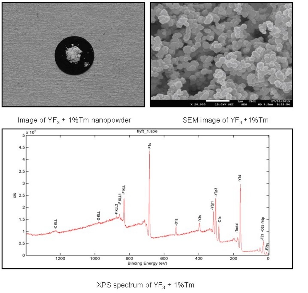 Up-conversion phosphors emit visible light after excitation by lower energy photons, usually in the near infrared spectral range. They have potential applications in different fields of science and technology, including luminescent displays, optoelectronic devices or lasers and amplifiers. Recently, a great interest has been devoted to their use in infrared (IR) and visible imaging for biological research and medical diagnosis, because of their important advantages when compared to the traditional biolabels such as organic dyes, semiconductors or metallic nanoparticles. For example, the up-conversion mechanisms are favourable compared to traditional down-conversion ones due to the higher penetration depth of light achieved in tissues under IR excitation wavelengths. Moreover, this excitation scheme also accounts for the lower photo-damage to living organisms, and the possibility of obtaining a higher spatial resolution and weak autofluorescence from cells or tissues. Additionally, it is possible to obtain nanophosphors with low toxicity, which is also one of the main points of interest in comparison with other bio-labels. Rare-earth (RE) based up-conversion nanophosphors are based on the combination of ion pairs acting as sensitizers–activators that allow a variety of excitation–emission choices.[1] In the present work we have synthesized nanopowders using thermal decomposition method as follows. Firstly, the Y2O3 was dissolved in acetic acid, RE2O3 in diluted nitric acid and NH4F in deionized water. Next all solutions were mixed together and stirred for 6 h at 70 ºC. During slow evaporation of the mixture the volume was decreased 5 times. Then the concentrated solution was dried in 150C in order to total remove of water. Next the dry powder was calcined in air atmosphere in 400oC during 2 h. Electronic structure and atomic concentration of samples were characterized by the following method X-ray photoelectron spectroscopy (XPS). References: 1. Marta Quintanilla, Nuria O. Nunez, Eugenio Cantelar, Manuel Ocana and Fernando Cusso, Tuning from blue to magenta the up-converted emissions of YF3:Tm3+/Yb3+nanocrystals |