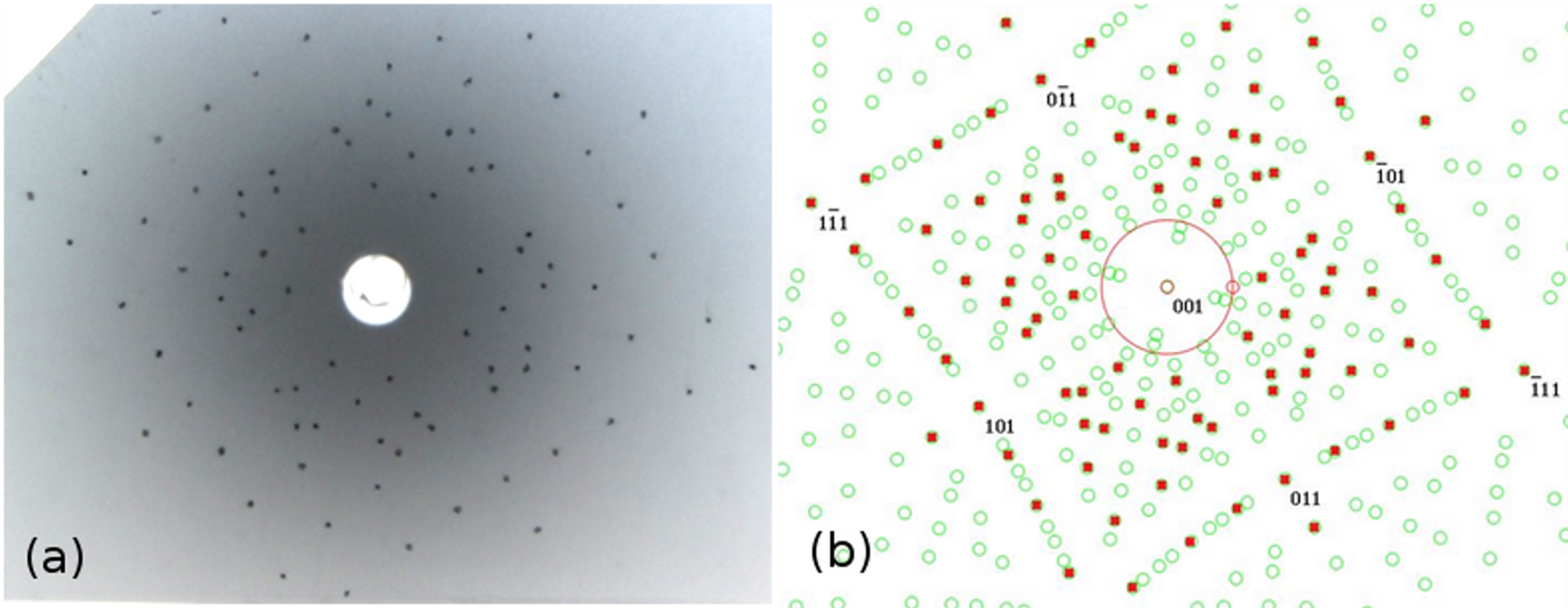 Strontium barium niobate (SrxBa1-xNb2O6 - SBN) is a ferroelectric material, which belongs to the tetragonal tungsten bronzes (TTB) family. At room temperature SBN crystallizes in a wide solid solution range - 0.25<x<0.75. Below the Curie temperature - TC, it has the P4bm space group [1]. In ferroelectric phase, SBN has the 4mm point group symmetry, which goes to centrosymmetric 4/mmm point group above TC. SBN possesses many potential applications owing to its large pyroelectric and electrooptic coefficients and photorefractive properties. Pure and undoped Sr0.72Ba0.25Nb2O5.97 single crystals with 72% at. content of strontium grown by Czochralski method were investigated. The real composition of the single crystals was determined using the Inductively Coupled Plasma-Optical Emission Spectroscopy (ICP-OES) method [2]. Basic measurements of the lattice parameter were have been carried out using the X-ray Bond’s method which allows obtaining a accuracy of the order of Δd/d = 10-5. For this purpose, the metric wavelength of λ CuKα1 = 1,54059292 ± 4,5x10-7 Å [3] is required. Measurements of the lattice parameters were performed using 15,4,0 (θ = 73.591°) reflex for an orientation parallel to the crystallographic Z axis and 005 (θ = 77.029°) reflex for an orientation perpendicular to the crystallographic Z axis. Details of measuring principles were presented earlier [4]. Measurements of a and b lattice parameters were repeated 10 times at 298 K. The obtained values of lattice parameters were a = 12.43439 ± 0.00027 Å and b = 12.43451 ± 0.00014 Å. Basing on the analysis of the obtained lattice parameter data it is ascertained that the investigated Sr0.72Ba0.25Nb2O5.97 single crystals crystallize in the tetragonal system. Fig. 1. Symmetry along [001]: (a) Laue backscattering pattern taken from (001) plane (b) simulated Laue pattern. Marked squares inside circles are the real equivalent Laue spots. Large uncertainty of the measured lattice parameters could have been caused by vibrations of atoms when approaching the temperature TC = 310K of the structural phase transition. Analysis of the diffraction patterns obtained by the Laue method confirmed the occurrence of a four-fold axis of symmetry (Fig. 1). The additional observations of conoscopic figures using a polarizing microscope technique showed an optical pseudo-biaxiality of the investigated crystals [5]. Such results do not exclude the tetragonal symmetry in the investigated strontium barium niobate single crystals. The results obtained by different X-ray and optical methods are compatible and coincide with the literature data. References [1] M. Ulex, R. Pankrath, and K. Betzler, Growth of strontium barium niobate: the liquidus–solidus phase diagram, J. Crystal Growth 271 (2004) 128 - 133. [2] T. Łukasiewicz, M.A. Świrkowicz, J. Dec, W. Hofman, W. Szyrski, Strontium-barium niobate single crystals, growth and ferroelectric properties, J. Crystal Growth 310 (2008) 1464 - 1469. [3] G. Holzer, M. Fritsch, M. Deutsch, J. Hartwig, E. Forster, Kα1,2 and Kβ1,3 x-ray emission lines of the 3d transition metals, Phys. Rev. A 56 (1997) 4554-4568. [4] K. Wokulska, P. Pacek, J. Dec, T. Łukasiewicz, M. Świrkowicz, Characterization of Phase Transition in Strontium Barium Niobate by Bond Method, Solid State Phenomena 163 (2010) 264-267. [5] J. Dec, T. Łukasiewicz, Crystallooptics of tetragonal tungsten bronze materials, Book of Abstract of the XXII Conference on Applied Crystallography (2012) 73. |