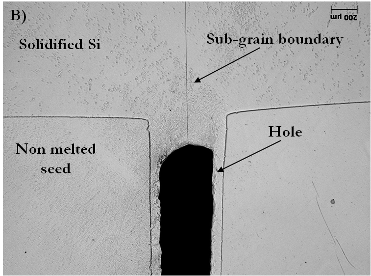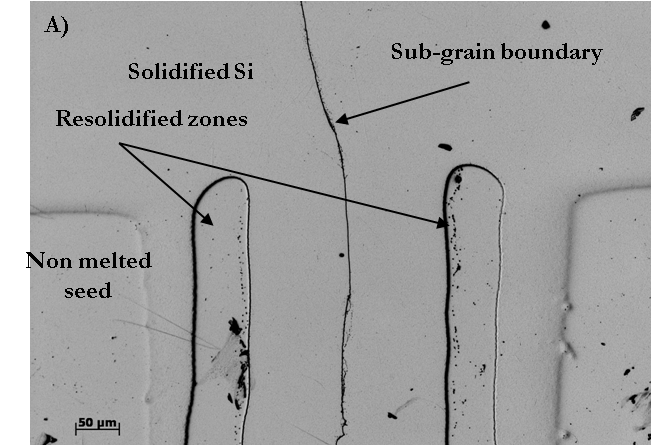 The main challenge of industrial-scale production of photovoltaic devices is the growth of large, high quality Si monocrystals at a much lower cost than that of microelectronics quality crystals. Directional solidification has become a very promising method for achieving this. With the use of an extended monocrystalline seed, high quality “mono-like” Si crystals [1, 2] can be grown. However, multiple seeds are needed in order to grow large crystals and that fact raises the question of growth at the boundary between seeds. In the present work, we investigate the early stages of Si solidification in the region where the liquid Si penetrates between two seeds, and the evolution of the crystal growth from this region. Synchrotron radiation Bragg imaging (white beam, monochromatic section topography, “weak beam” images) was applied to samples grown from melted silicon on oriented seeds with a small gap between them. The images showed the subgrain boundary and even very low subgrain misorientation could be measured, while the generation and evolution of dislocations during growth was followed. Besides X-ray diffraction imaging, Scanning Electron Microscopy (SEM) and micro-Fourier Transform Infrared Spectroscopy (μ-FTIR) mapping were applied, the latter showing the elemental distributions of oxygen, iron and carbon. In the present study, two cases are examined of samples cut parallel to the growth directionas shown in the SEM images in Figure 1. In Figure 1A we observe the presence of two distinct, vertical, resolidified zones between the seeds; and in Figure 1B, the existence of a hole is observed in the same area. As the regrowth proceeded from the seeds, the presence of a sub-grain boundary was observed between the two seeds in both cases. With the aid of white beam image topography (Figure 2) we observe that in both cases the solidified Si is built of two separate sub-grains which are slightly misoriented but both of them are well crystallized and follow the crystallographic orientation of the seed. However, in case A, networks of dislocations are generated at the top edges of the resolidified zones, while in case B, no such bunches of dislocations are observed.