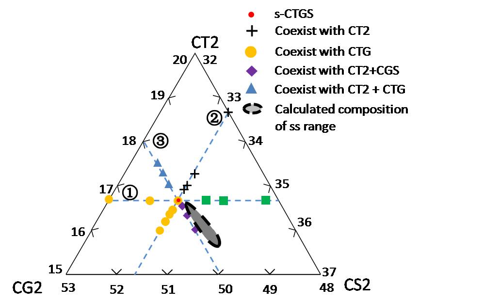 Langasite-type (LGS-type) crystal with four elements in A3BC3D2O14 structure has been intensively studied as a group of piezoelectric crystal[1,2]. Recently, we have found the amount of thermally activated holes in LGS-type crystal depends on metal vacancy (Vm×), which crucially affects conductivity of bulk crystal[3]. However, no study on the site occupancy of Vm× has been carried out in LGS-type crystal with four elements so far. Site occupancy model (SOM) is able to raise all the possible site-structure of constituent elements and corresponding defects. In LGS-type crystal, Ca3TaGa3Si2O14 (CTGS), 6 site-structures out of 16 are possible but not essential to exist. So,solid solution range (ss range)was determined in CTGS to verify which site-structuresexist. 3 compositional series of CTGS were synthesized: 1. Ca,Ta-stoichiometric (-s), changing Ga and Si ratio; 2. Ca,Si-s, changing Ga and Ta ratio; 3. Ca,Ga-s, changing Ta and Si ratio, as shown in Fig. 1. Secondary phases were observed with backscattering electron image (BEI). In the sintered materials, four kinds of secondary phases in the composition of CaTa2O6 (CT2), Ca3Ta2Ga4O14 (CTG), CaSi2O5 (CS2) and Ca3Ga4Si2O13 (CGS) were recognized. The lever rule was applied to obtain ss range from composition and relative quantity of secondary phases. In CTGS, ss range locates at Ca-s, Ta, Ga-poor and Si-rich area, the calculated composition of the boundary of ss range was shown in Fig. 1. Only one of the 6 possible site-structures is applicable in CTGS, which shows B site accommodates Vm×. The quantitative relationship between Vm×and antisite defect is also deduced by this SOM site-structure: 5SiGa- VTa=0, where SiGa is Si population in Ga site. This result indicates Vm× in CTGS bulk crystal will generate significant amount of holes at elevated temperature, which is harmful to conductivity stability. This work suggests the method that SOM discussion accompanied with ss range measured by investigating secondary phase is valid to study site of Vm×in a certain LGS-type crystal.