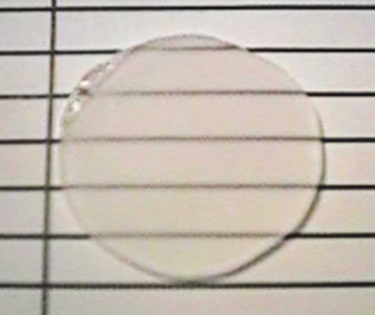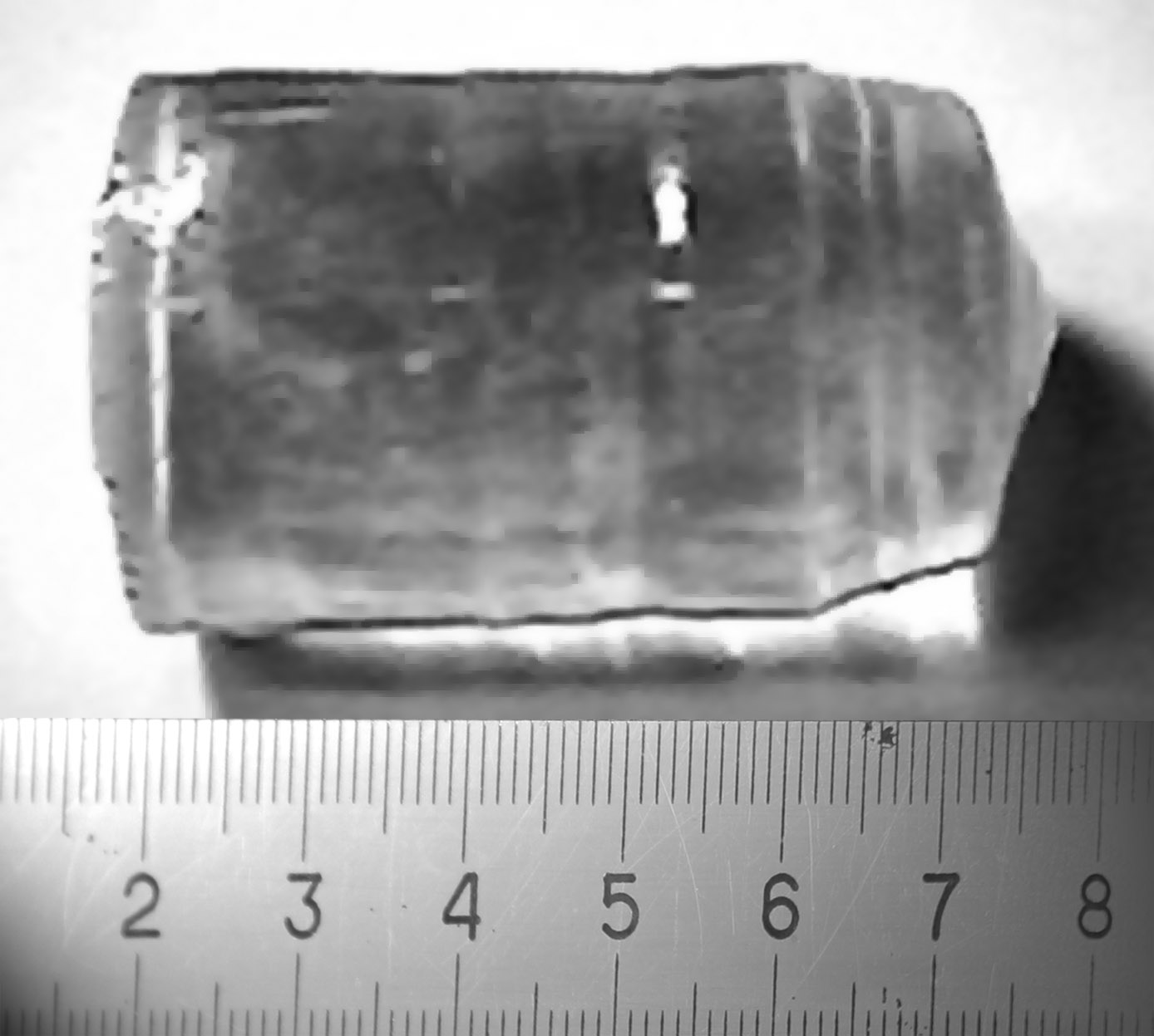 Fig.1. Li2MoO4 single crystal grown by Czochralski technique and Ø25х1 mm plate cut from the crystal The crystals corresponded to R3 (phenacite-type structure) space group: a=14,32±0,02 Å , c=9,56±0,03 Å / The crystal density derived from XRD data (3.06± 0.01g/cm3) was slightly different from the hydrostatic density (3.03± 0.01g/cm3). It was found out that Li2MoO4 crystals had no MoO42-complexes distortion. Raman spectra had shown differences for || с oriented and ⊥c oriented crystal spectra (Fig.2).