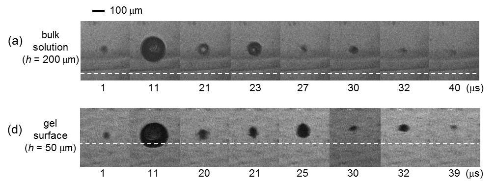 High-quality single crystals of protein are indispensable for determining the three-dimensional structure of protein by X-ray crystallography. However, the production of such high-quality protein crystals is still challenging because nucleation of proteins generally occurs at very high supersaturation. We previously reported a novel technique to induce nucleation at low supersaturation by focused femtosecond laser irradiation and obtained high-quality protein crystals of various proteins.1) We revealed that laser-induced cavitation bubbles transiently and locally concentrate a supersaturated solution.2) We are now investigating the detailed correlation between cavitation bubble behavior and protein nucleation.3) In this study, we studied the effect of gel-solution interfaces on the femtosecond laser-induced nucleation of proteins. Supersaturated solutions of hen egg white lysozyme (HEWL) were pipetted onto agarose gel and irradiated with femtosecond laser pulses (800 nm, 200 fs). We found that the nucleation efficiency could be modulated by the distance between the laser focus and agarose gel surfaces (h). In particular, laser irradiation near the gel surface (h = 50 mm) could induce nucleation at very low supersaturation, where no nucleation could be induced in the bulk solutions even with femtosecond laser irradiation (h = 200 mm) (Fig. 1). Such enhancement of the nucleation was also confirmed for the membrane protein, acriflavine resistance protein B (AcrB). To gain further insights into the role of gel-solution interfaces, we conducted fast imaging of cavitation bubbles. We found that the cavitation bubbles shrank asymmetrically and then finally collapsed toward the solution side (Fig. 2b, h = 50 mm). This is in contrast to the symmetric collapse in bulk solutions (Fig. 2a, h = 200 mm), which generates a large amount heat and chemical decomposition at the focus4). In addition, cavitation bubble behavior could be modulated by the gel concentration. These results indicate that the use of gel-solution interfaces is a successful method for the control of cavitation bubbles and can be cues to achieve effective nucleation. In this presentation, we will also discuss the correlation between the gel concentration and nucleation efficiency. Fig. 1. Nucleation probabilities for HEWL on agarose gel. Fig. 2. Microscopic fast imaging of cavitation bubbles. Reference |