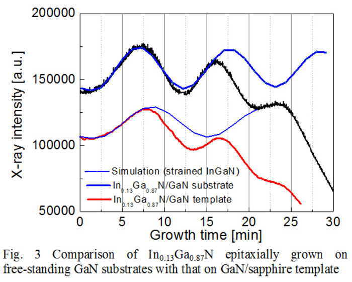 High quality InGaN-based quantum wells (QWs) have undergone remarkable development because of their practicalapplications in high-frequency and high-power field-effect transistors, light-emitting diodes, and laser diodes. Metalorganic vapor phase epitaxy (MOVPE) has been the leading technique for the commercial growth of wide band-gap InGaN due to its big market. However, many problems are still unsolved and little is known what is going on during the growth process. Then, in situ measurements for InGaN growth are required to understand the growth of the layers under the growth conditions, and this may help to develop and fabricate better quality InGaN QWs. We have set up an MOVPE chamber installed in alaboratory level X-ray diffractometer (Rigaku RINT-TTRIII). In our previous work, the preliminary experiments of X-ray diffraction (XRD), X-ray crystal truncation rod (CTR) scattering and X-ray reflectivity (XRR) measurements at various growth temperatures of InxGa1-xN growth were reported [1,2]. A combination of these techniques was used for investigation on the In0.09Ga0.91N SQW structures with InGaN of several monolayers (MLs) thickness at 830 °C [3]. Annealed InGaN epilayers and GaN decomposition were also studied by using in situ XRR [4]. However, the measurement time of CTR and XRR measurements is too long to realize real time investigation during the formation of heterostructures, because of measuring with the angle scan. In this work, a continuousin situ XRR observation on InGaN epitaxially grown on free-standing GaN substrate and GaN(2 mm)/sapphire template without the angle scan is reported. The analysis of the strain relaxation of InxGa1-xN epilayers is conducted.