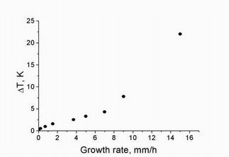 Bismuth Orthogermanate (Bi4Ge3O12) is widely used as a scintillation material. Although this crystal is grown for a long time, unsolved questions about the mechanisms of crystallization remain, in particularly, the influence of the growth rate on the quality of the crystals. Change of temperature at the heater versus BGO crystal growth rate The value of the temperature drop ΔT on the heater with increasing the crystallization rate Vcryst. is determined by two main factors: the increase in supercooling and increase heat flow to remove the heat of crystallization. The contribution of the second factor is a linear function of growth rate and could be estimated from series experiments. The results are compared with data published in [3-5] where the values of supercooling were found by direct measurements of temperature on the crystal’s face. [1] H.J. Scheel // J.Cryst. Growth, 2000, v.211, p.1. |