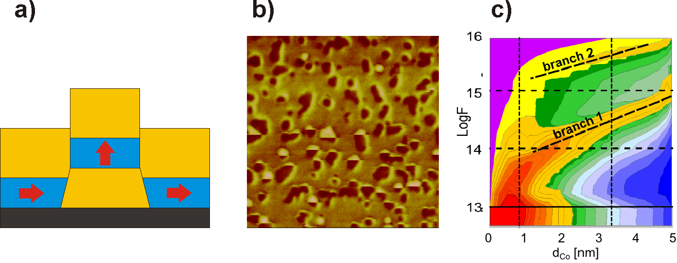 | Magnetic layered structures spatially patterned in a nanoscale are of great scientific interest and high technological relevance. Such systems are excellent objects to perform fundamental studies on nanomagnetism as well as they are promising for practical applications: as magnonic crystals, sources of local magnetic fields in spintronics devices, or as magnetic recording media, in which undesired influence of superparamagnetic effects is substantially reduced. In this work we discuss different methods of magnetic patterning of Co-based sandwiches: by a spatially structured buffer and by irradiation with an ion beam. Magnetic properties studied by magnetometry utilizing magnetooptical Kerr effect (MOKE) and magnetic force microscopy (MFM) are correlated with structural features of the investigated patterned systems. In the first method magnetic patterning is induced by deposition of a Co layer on a structured buffer in the form of Au islands, few hundred nanometers in lateral size, self-assembled on a Mo layer surface [1]. Observed Volmer-Weber growth mode is a consequence of surface energy interplay of low-index free atomic planes of Au and Mo and Mo/Au interface as well as elastic energy originating from a lattice mismatch. Due to strong dependence of magnetic anisotropy on a buffer/Co-film interface type, a system of elevated magnetic dots (Co layer grown on the top of the Au islands) embedded in the magnetic trench matrix (Co layer deposited between the Au islands on the Mo layer surface) with various dot - matrix magnetization orientations (Fig. 1a) has been fabricated [2, 3]. A buffer material influences the surface anisotropy due to hybridization of electron orbitals at the interface and magnetoelastic contribution resulting from the lattice mismatch. Moreover, the structure of the buffer affects the growth of the Co layer and in consequence – the magnetocrystalline anisotropy. As the size of the magnetic dots is determined by dimensions of the Au islands, tuning of magnetic properties of the dots and their surface density becomes possible by control of the Au islands growth conditions on the Mo layer surface. Combination of the results obtained from the PMOKE and MFM reveals magnetization switching mechanism of the dots by nucleation of a reversed domain followed by rapid and unpinned domain wall propagation (Fig. 1b). High crystalline quality of the studied epitaxial patterned structures, which are not exposed to any post-growth treatment, explains a monodomain character of the magnetic dots. Low amount of structural defects, confined dimensions and stiffer magnetization at the edges are responsible for higher nucleation field of the reversed domain in the dot in comparison with the uniform Au/Co/Au reference film. For the same reason the domain wall propagation is unperturbed. Thus, once nucleated, the reversed domain expands rapidly by the domain wall propagation over whole area of the dot. In the second method the Pt/Co/Pt sandwiches are irradiated by an ion beam. As-deposited structure with in-plane magnetization exhibits consecutive reorientation spin transitions from in-plane to out-of-plane alignments and vice versa with an increasing fluence of the beam (Fig. 1c) [4, 5]. Observed behavior results from two competitive processes undergoing upon irradiation: (i) degradation of the interfaces (initially with a sharp chemical profile) which suppresses PMA and (ii) formation of ordered CoPt alloys exhibiting enhanced PMA. In-depth chemical profile and composition of the forming intermetallic alloys were estimated with use of TRIDYN simulations. Results obtained from these simulations and those revealed from XMCD measurements lead to a conclusion that L10 and L12 phases are responsible for PMA appearance with increasing irradiation fluence. Controlled irradiation of the Pt/Co/Pt sandwiches with focused ion beam is expected to allow fabrication of structures periodically patterned in a nanoscale with desired properties of the irradiated spots. Acknowledgement: This work has been partially supported by the National Science Center in Poland under the project no. DEC-2011/03/N/ST3/02662 and by the Foundation for Polish Science under the SYMPHONY project operated within the Team Programme, co-financed by the EU European Regional Development Fund, OPIE 2007-2013. ![]() Fig.1. a) schematic representation of a magnetic dot with perpendicular magnetization embedded in a matrix magnetized in the plane (black: Mo buffer, blue: Co layer, yellow: Au island and cap layer, red arrows: magnetization directions); b) magnetization reversal (visible in the lower part of the MFM image) of the dots while scanning with a magnetic tip; c) a diagram (dCo - Co layer thickness; F- Ga ion fluence) of magnetization orientation in Pt/Co/Pt sandwiches. Two branches of perpendicular magnetization are distinct (blue and green – magnetization in-plane; yellow and red – perpendicular magnetization, magenta – superparamagnetic state) [4]. [1] A. Wawro, M. Sobańska, A. Petroutchik, L. T. Baczewski and P. Pankowski, Nanotechnology 21, 335606 (2010).[2] A. Wawro, A. Petroutchik, L. T. Baczewski, Z. Kurant and A. Maziewski, Europhys. Lett. 89, 37003 (2010). [3] A. Wawro, E. Sieczkowska, A. Petroutchik, L.T. Baczewski, Z. Kurant, A. Maziewski, Phys Rev. B 83, 092405 (2011). [4] A. Maziewski, P. Mazalski, Z. Kurant, M.O. Liedke, J. McCord, J. Fassbender, J. Ferré, A. Mougin, A. Wawro, L.T. Baczewski, A. Rogalev, F. Wilhelm, T. Gemming, Phys. Rev. B 85, 054427 (2012). [5] P. Mazalski, Z. Kurant, A. Maziewski, M. O. Liedke, J. Fassbender, L. T. Baczewski, A. Wawro J. Appl. Phys. 113 17C109 (2013). |
