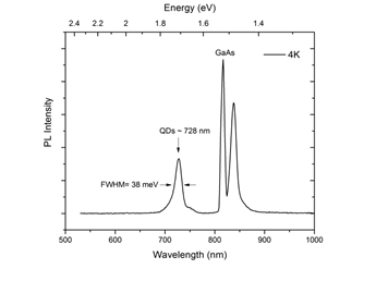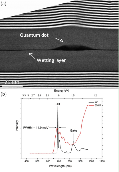 Figure 4: (a) TEM image of GaAs/AlGaAs QDs embedded in GaAs-AlAs SL and (b) 4K and 300K PL spectra Fig 4(a) shows a transmission electron microscopy (TEM) image of a GaAs/AlGaAs QD embedded in GaAs/AlAs SL structure. A continuous WL under the QDs is clearly observed. Low-temperature and room temperature PL spectra from the same sample are shown in Fig. 4(b). The very narrow PL emission (FWHM of 14.9 meV) observed from the QDs at 4K (centred at 689 nm) indicates high optical quality and excellent dot uniformity. Despite the low areal number density of 108 cm-2 the QD peak in Fig. 3 is now more intense than the GaAs peak, which we attribute this to efficient transfer of carriers from the SL to the WL and from the WL to the dots. At room temperature, the PL shows a series of sub-peaks, which we attribute to different quantum confined dot states. 1. D Bimberg, M. Grundmann., and N.N Ledentsov, Quantum Dots Heterostructures1999, New York: Wiley. |