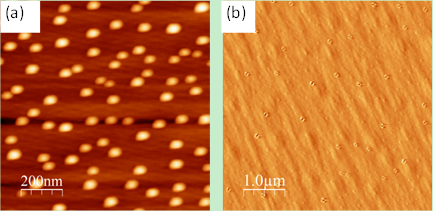 Self-assembled growth of high-quality quantum dots (QDs) is important for fabricating novel and effective electronic and photonic devices [1]. Typically, QDs are obtained via the Stranski-Krastanow (SK) growth mode, which reduces strain arising from lattice mismatch in underlying layers. A defining feature of SK growth is the formation of a wetting layer (WL) that precedes dot growth. The WL mediates the electronic interaction between the barrier states and the localized QD states influencing the optical properties of the QDs. Charge transfer between QDs via higher energy states can, for example, prove advantageous for laser operation [2]. SK growth is not possible in lattice-matched materials due to the absence of strain, droplet epitaxy (DE) is a promising technique, which enables self-assembly of strain-free QDs [3]. For the fabrication of GaAs/AlGaAs QDs, for instance, the size and density of the GaAs QDs is dependent on that of the Ga droplets, which is a function of growth temperature and Ga flux, and on the subsequent crystallisation process with As flux. However, QDs are formed without a WL, unless special growth conditions are used [4]. Besides potential advantages in terms of carrier transfer, inclusion of a GaAs WL is expected to improve the As adatom surface diffusion resulting in the growth of more uniform dots. Here, we report GaAs/AlGaAs QDs with highly uniform size and excellent optical properties. Figure 1(a) shows Ga droplets with an average diameter of 69±4 nm formed by the deposition of 3 monolayers (MLs) Ga on a GaAs substrate at 320ºC. GaAs/AlGaAs QDs with mean diameter of 99±10 nm were subsequently formed after supplying low As flux at 400ºC [Fig. 1(b)].