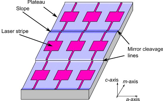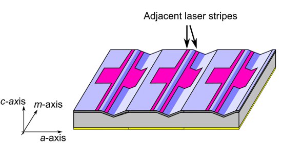(b) Fig. 2. (a) Schematic of a laser diode mini-array. Due to different substrate off-cut (and different indium content of the active region), each stripe emits at a different wavelength. (b) Schematic of a single stripe laser diode with non-absorbing mirrors. Due to increased substrate off-cut near the mirror facets, the amount of indium is lower in those regions than in the laser stripe region. Thus, light emitted in the stripe region is not absorbed in the facet region. |