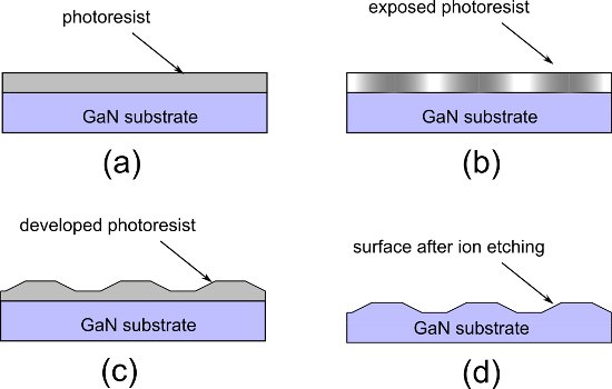 All modern GaN-based optoelectronic devices consist of a stack of epitaxial layers, with different chemical composition and thickness, grown on different kind of native or foreign substrates. In case of laser diodes (LDs), the substrate is always freestanding GaN, preferably with threading dislocation density not exceeding 106/cm2. For LD structure growth by MOVPE, the substrate crystal must not be exact oriented. Instead, a small off-cut (0.3-0.6 degree) of the surface is needed to maintain the step-flow growth mode. In case of III-nitride optoelectronic devices, the active region (most often quantum well structure) is made of the ternary compound, InGaN, and adding more indium to the compound lowers its bandgap from 3.5 eV for pure GaN down to about 0.9 eV for InN. Interestingly, for a fixed set of growth parameters (MOVPE), when the off-cut angle of the substrate is increrased, indium content in the layer decreases, respectively. This effect is also present when the off-cut angle is changed only locally (by special patterning technique), in several micrometer sized regions of the substrate. GaN substrates with differently angled regions can be fabricated using the well known technique for diffraction optics elements fabrication. In our case, it was special laser protholithography, capable of producing multilevel photoresist patterns, and ion etching, see Fig. 1. With this technique we were able to fabricate ridge-waveguide, edge emitting laser diodes with different amount of indium in the QWs (and emitting at different wavelengths) on a single substrate. In the present paper we will show how the local off-cut angle of the substrate influences LDs parameters such as the wavelength, threshold current and differential eficiency. We will also support the results by AFM and CL measurements. Next, we will show how the discussed substrate patterning technique could be used to obtain multiwavelength laser diode mini-arrays (see Fig. 2a.) and LDs with lower amount of indium near the mirror facet regions (Fig. 2b). In the latter case, we expect less light absorption, less heating and longer lifetime of high-power LDs. ![]() Fig. 1. Process flow for fabrication of GaN substrate with variable off-cut angle. (a) Exact oriented GaN substrate with uniform photoresist layer, (b) photoresist exposed by a laser writer with variable light dose, (c) photoresist profile after development, (d) GaN profile after ion ething.