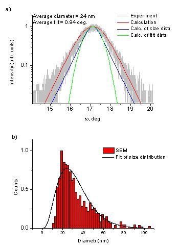 Recently the GaN nanowires (NWs) grown on various substrates have been extensively studied. At the same time many diagnostic methods are developed that allow analysis of NWs properties. For structural characterization the nondestructive X-ray diffraction (XRD) is mainly used. The structure of GaN NWs, as well as of planar layers, is described by mosaic model, which takes into account such parameters as tilt, twist and size of mosaic blocks. All these parameters cause broadening of the X-ray diffraction curves (XDC) for both types of epitaxial structures. However, there are a strong differences between the full width at half maximum (FWHM) of XDCs of nanowire and planar GaN layers. For GaN layers different types of dislocations contribute mainly to the XDC broadening, while for dislocation free GaN NWs broadening is cased by the their small size as well as by large values of tilt and twist (spatial orientation). Attempts to fit the XDC by Lorentzian and Gaussian functions, as well as their combinations, often do not describe experimental observations. Moreover, this approach doesn't give any information about physical parameters which affect the broadening of XDC. Only modeling of XDC and comparison of calculated and experimental curves allow obtaining real structure parameters of NWs. In this paper, we study the profiles of X-ray diffraction peaks from self-assembled GaN NWs grown by PAMBE (760oC) on Si(111) substrate. As the sizes of scattering objects (NWs) are small, the X-rays kinematic scattering theory is applied. The peak profile was calculated taking into account coherence of the x-ray beam, size and spatial orientation distributions of NWs. As it can be seen from Fig. 1a, the best fit of experimental and calculated ω-scan for 0002 reflection from NWs GaN/Si(111) was obtained considering both distributions of NW's tilt and diameter. Moreover, the diameter distributions obtained by calculation of XDC well correlate with distributions obtained by SEM (Fig. 1b). All results obtained by modeling of XDC from GaN NWs will be compared with results from other X-ray diffraction techniques (Williamson-Hall, reciprocal space mapping) as well as with complimentary methods (SEM, AFM etc.). Fig.1. Calculated and experimental XRD ω-scan for 0002 reflection of GaN NWs (a); experimental and fitted diameter distributions (b). This work was supported by the European Union within European Regional Development Fund, through grant Innovative Economy (POIG.01.01.02-00-008/08 NanoBiom). |