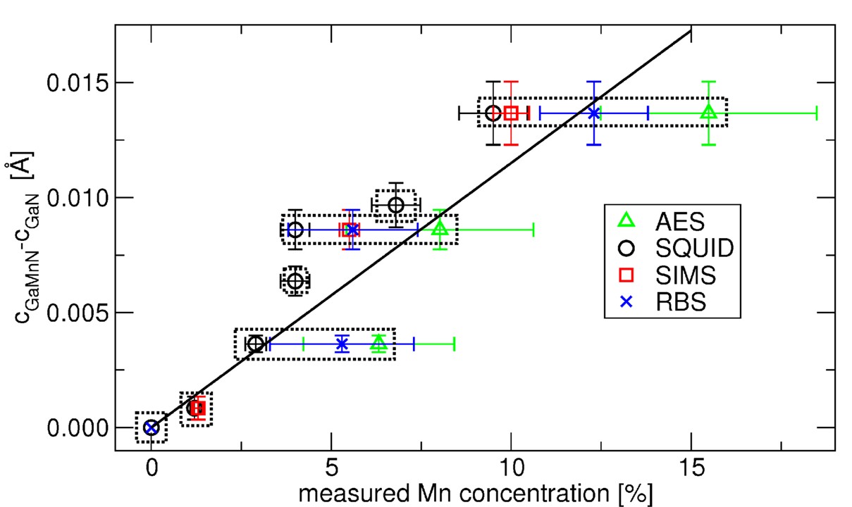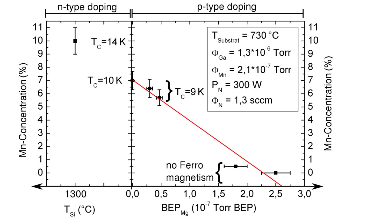 References 1 A. Bonanni et al., Phys. Rev. B, 84, 3 (2011). 2 M. Sawicki et al., Phys. Rev. B, 85, 20 (2012). 3 E. Sarigiannidou et al., Phys. Rev. B, 74, 041306 (2006). 4 J. Blinowski et al., Phys. Rev. B 53, 9524 (1996). 5 K. Sato et al., Rev. Mod. Phys. 82, 1633 (2010), and references therein. 6 G. Kunert et al., Appl. Phys. Lett. 101, 022413 (2012). 7 D. Chiba et al., Appl. Phys. Lett. 90, 122503 (2007). Figure 1: Change of c-lattice parameter with Mn content, determined by different methods. Measurements belonging to the same sample are marked by a dashed rectangle. Figure 2: A shift in the fermi-level by Si- or Mg-doping leads to a significant change in the Mn concentrations incorporated under the same growth conditions. |