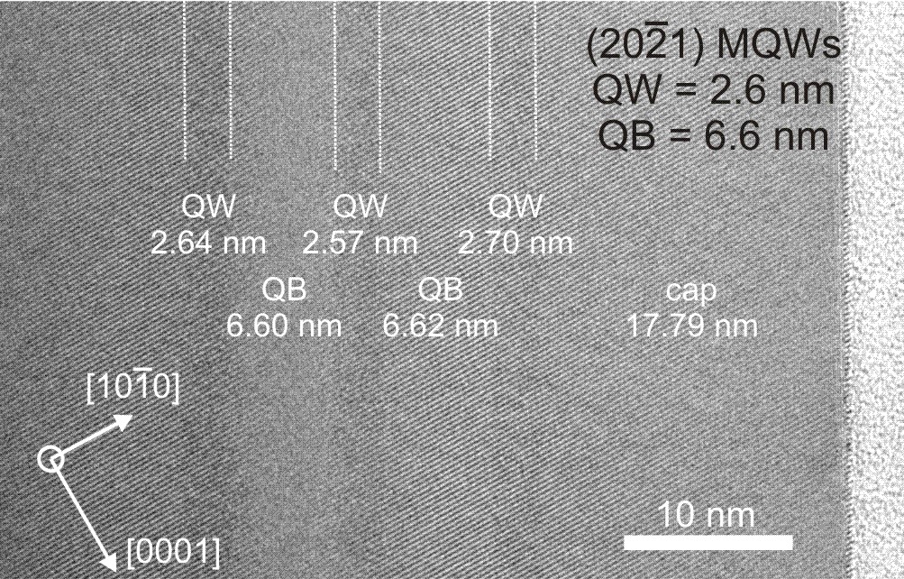 Fig 1: High resolution transmission electron micrograph (HRTEM) of the semipolar multi-quantum well structure grown by PAMBE that builds the LED and LD active region. Both the surface and interfaces are very smooth. The thickness of the respective layers is indicated in the image, dash lines mark the position of the interfaces.