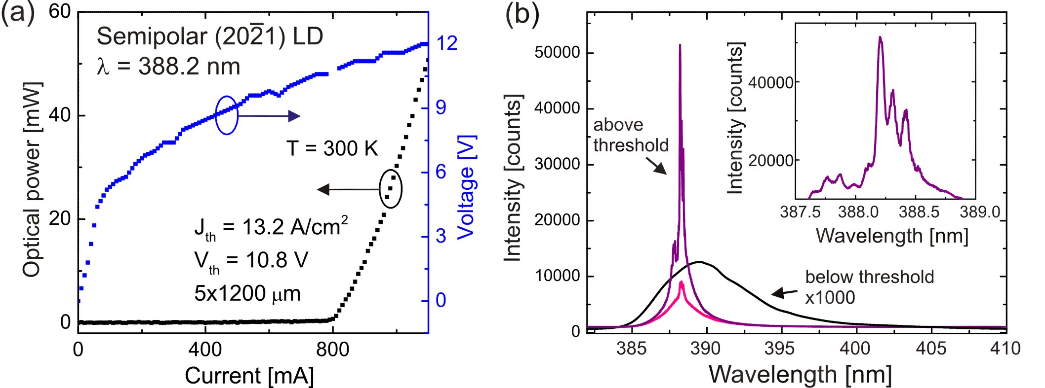 Fig 2: (a) Light-Current-Voltage characteristics of the semipolar LD with laser stripe along the [1120] direction. (b) Room temperature high resolution spectra of the semipolar laser diode below (pink and violet curves) and above the lasing threshold. Inset shows the magnified spectrum around the lasing wavelength 388.2 nm.. |